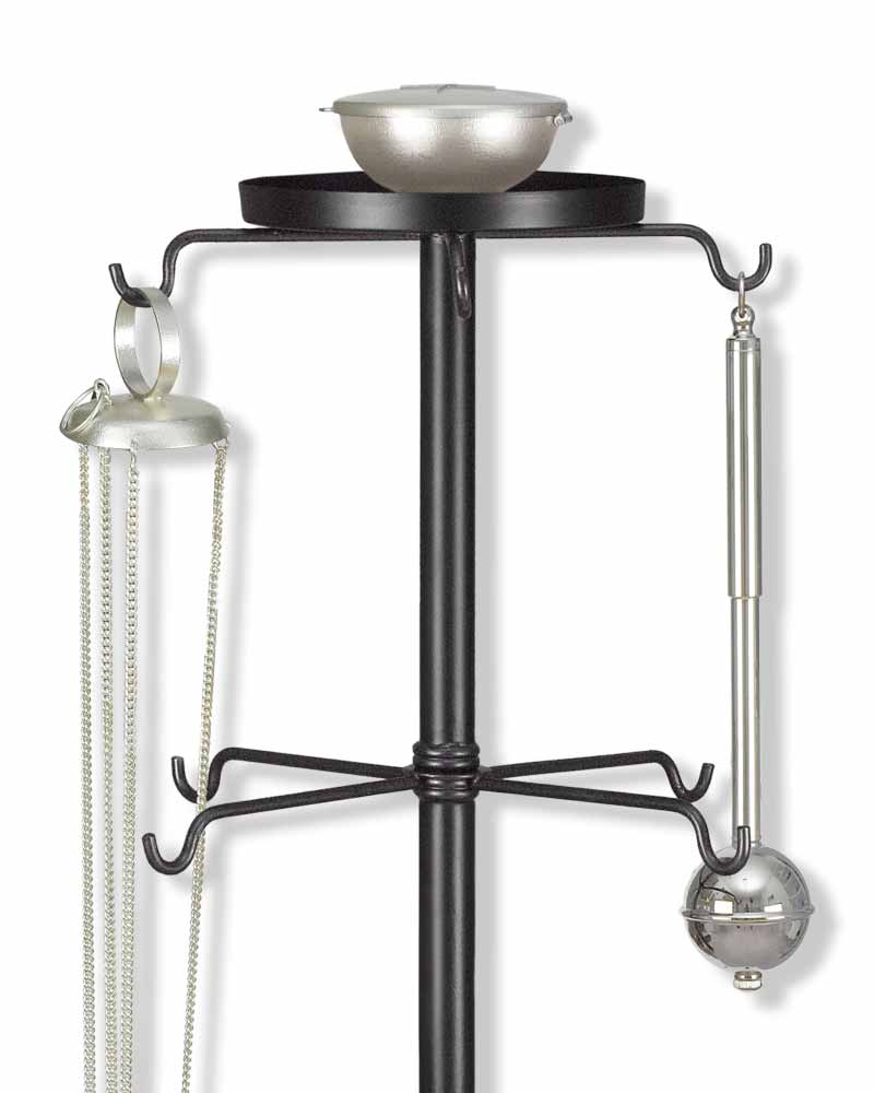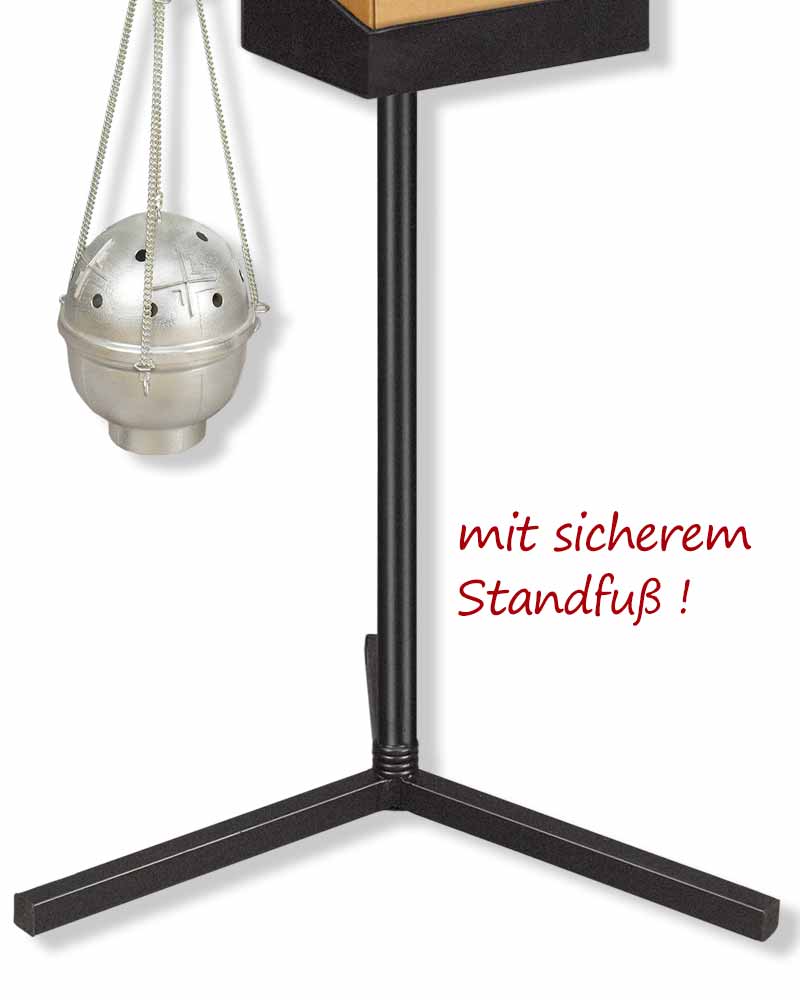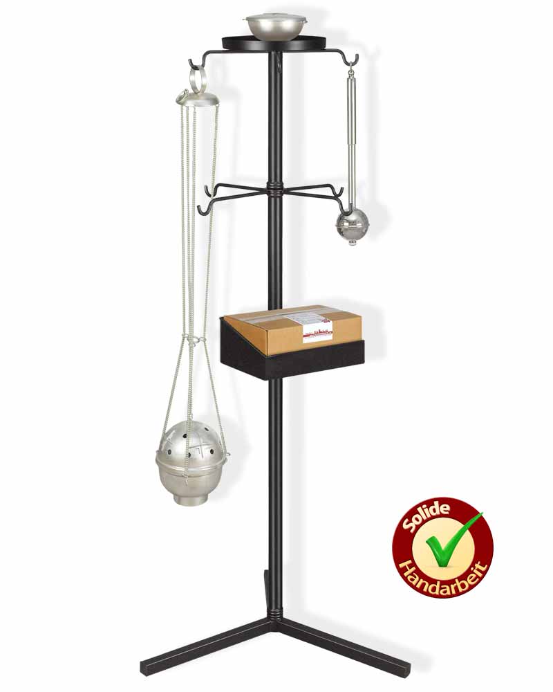 Rauchfaßständer Stahl schwarz, 128 cm hoch, mit großer Ablageplatte 20 cm Ø, 8 Haken, zerlegbar. Weihrauchständer mit vielfältigen Aufbewahrungsmöglichkeiten für Rauchfässer, Aspergill oder Weihwasserkessel. Die robuste Oberfläche ist pulverbeschichtet und somit rostfrei, mit standfestem Dreifuß, 127 cm hoch. Ausführung mit großer Abstellplatte 20 cm Ø, 8 Haken und Kohlekasten. Die teilbare Ausführung lässt sich kostengünstig versenden und bei Bedarf platzsparend aufbewahren.