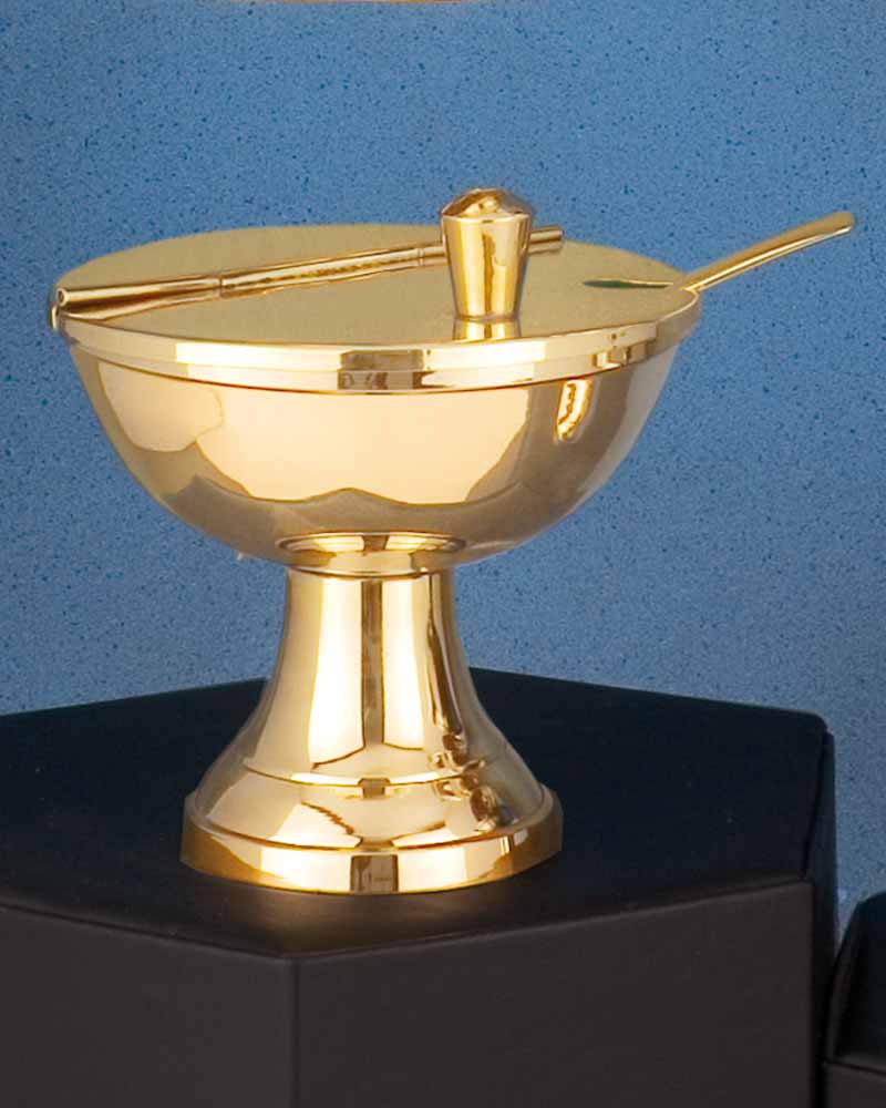 Weihrauchschiffchen aus solidem Messing, poliert und anlaufgeschützt. Das Schiffchen ist mit einem Klappdeckel und Knauf gearbeitet, und wird mit einem kleinen Löffelchen ausgeliefert. 9 cm hoch