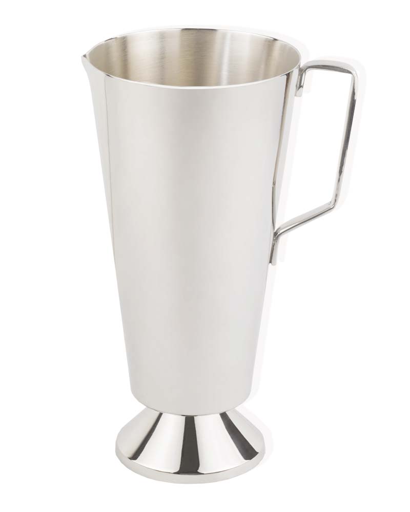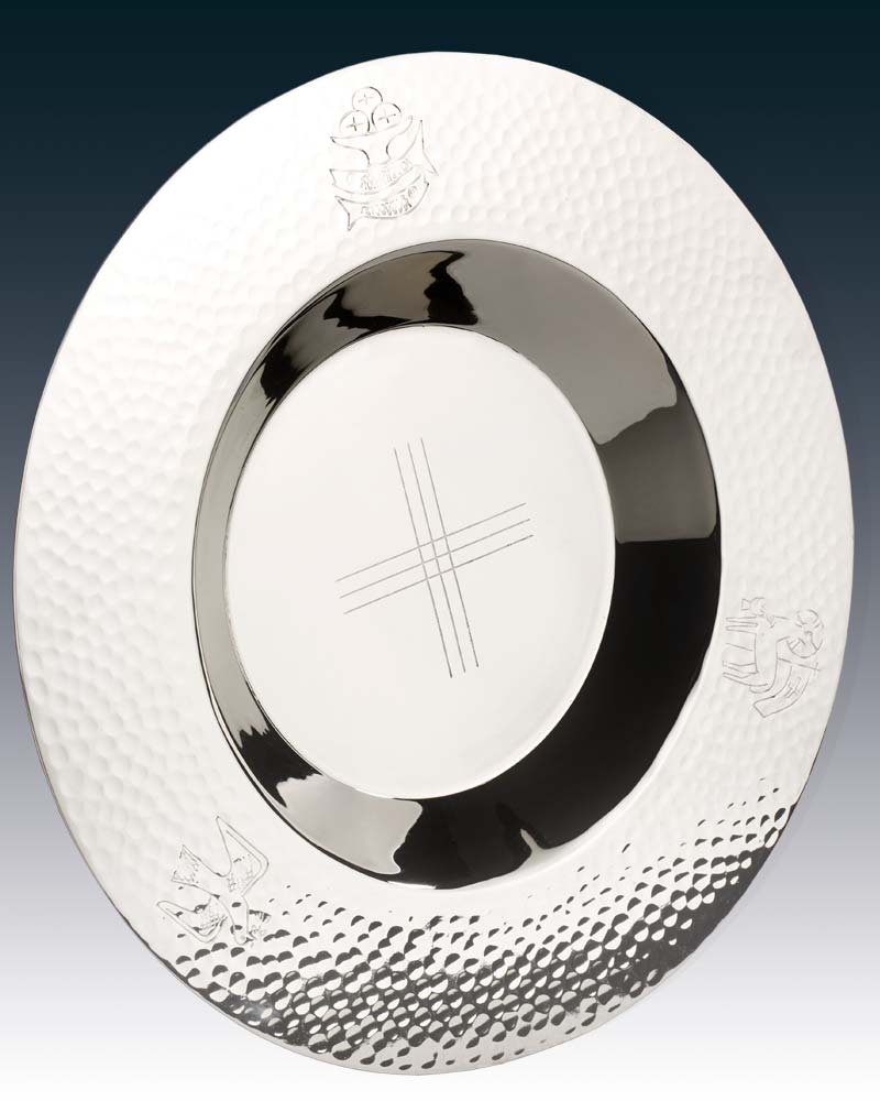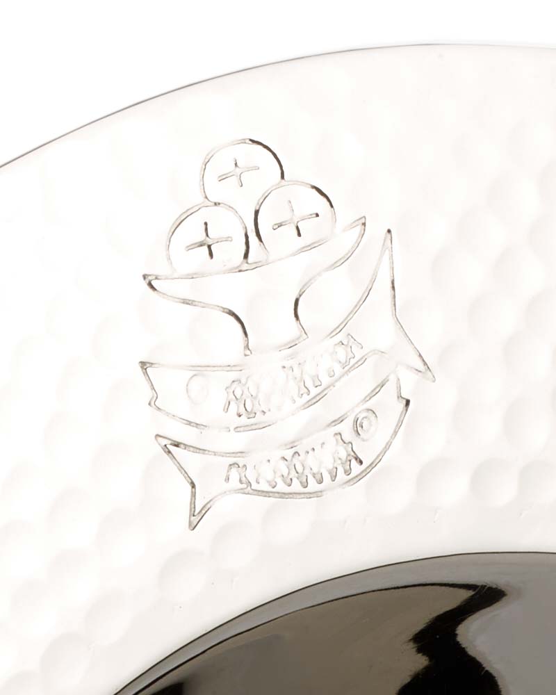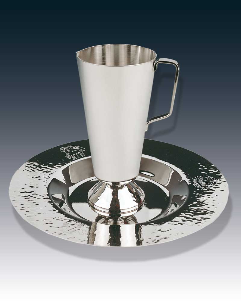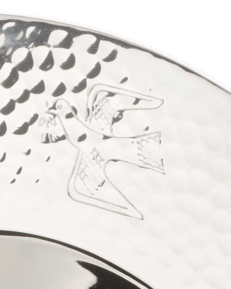 Taufgarnitur gehämmert, vernickelt und poliert. Die 2,5 cm tiefe Schale hat 27 cm Durchmesser mit Gravursymbolen, Fisch + Brot, Taube + Ölzweig, Lamm Gottes. Kanne mit Standfuß, 18 cm hoch.