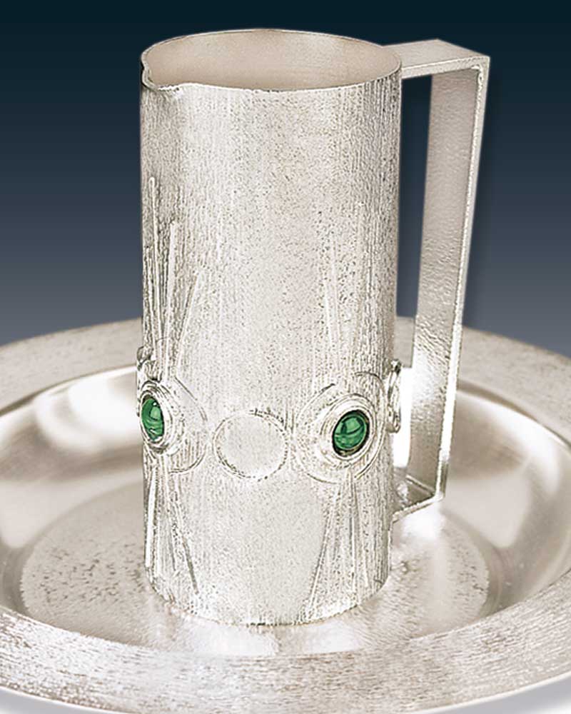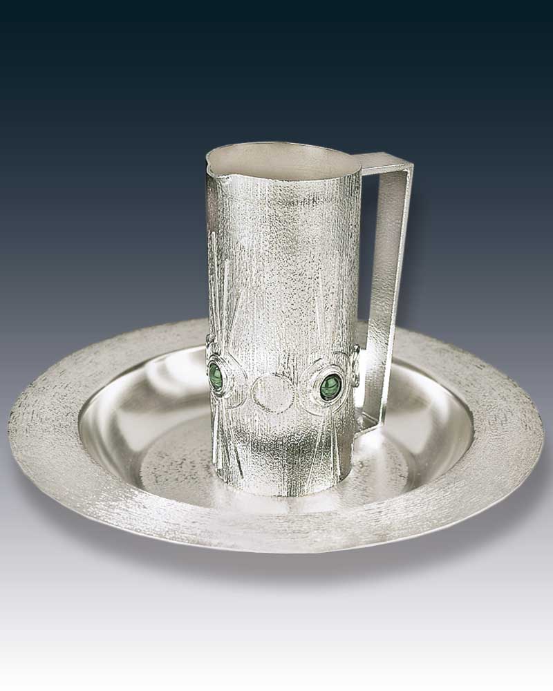 Taufgarnitur mit unempfindlicher, feiner Struktur, versilbert und anlaufgeschützt. Die Kanne ist 18 cm hoch, mit einer Belötung und Grünachaten geschmückt. Die tiefe Wasserschale hat 30 cm Durchmesser.