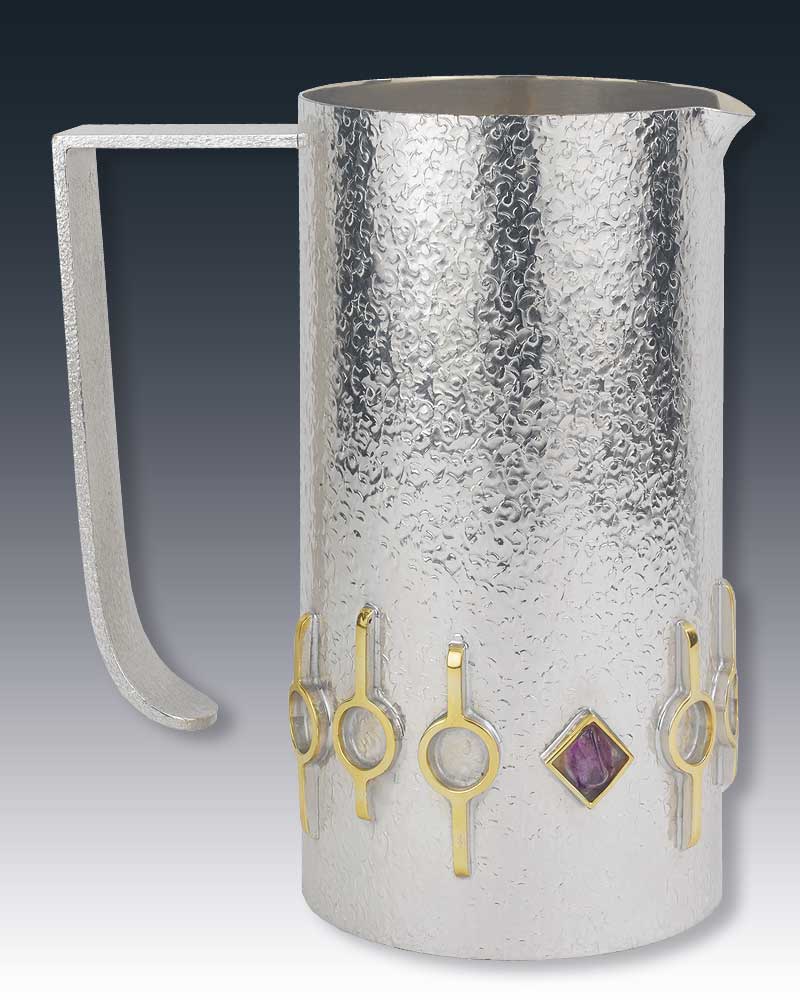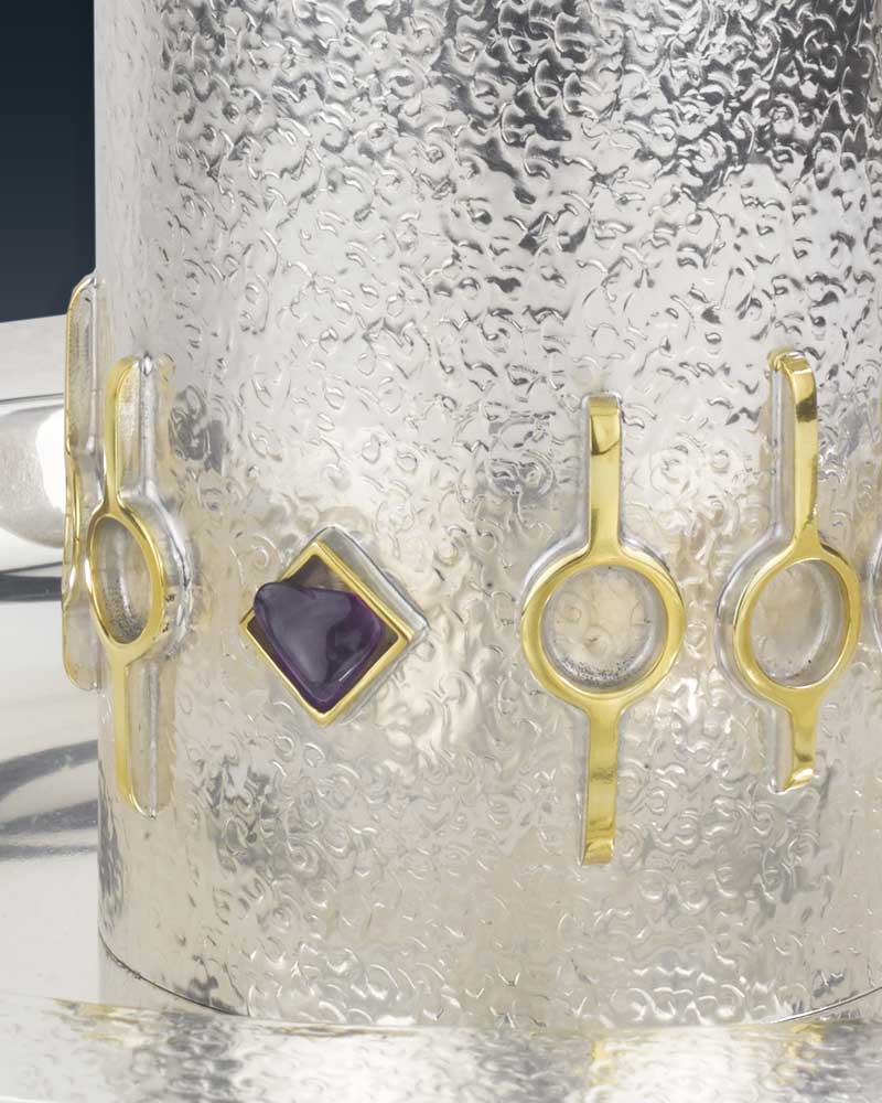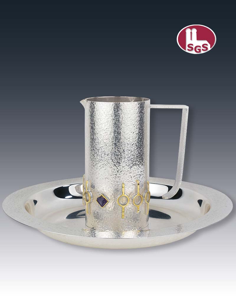 Die Taufgarnitur ist versilbert und gehämmert, mit ziervergoldeter Stegbelötung und eingefassten Amethysten. Der Boden des Tabletts hat eine Metallplatte mit Verzierung, diese sorgt für einen festen Stand der Kanne und verhindert Verrutschen. Die Kanne ist 16 cm hoch und hat einen Durchmesser von 8 cm, das Tablett hat einen Durchmesser von 29,5 cm.