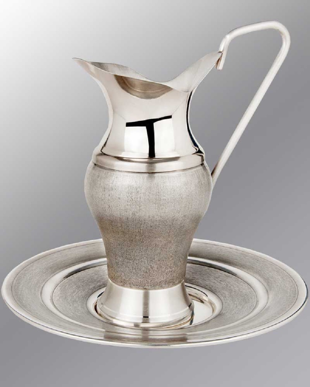 Taufgarnitur versilbert, oxydiert, Kanne in bauchiger Form, 25 cm hoch, Fuss 8 cm Ø, Teller 26 cm Ø.