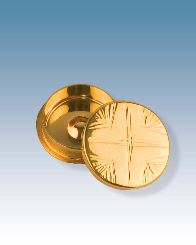 Versehpatene vergoldet mit gehämmertem Kreuz 4,5 cm Ø. Hostiendose mit Steckdeckel, ist mit bis zu 12 Brothostien befüllbar.