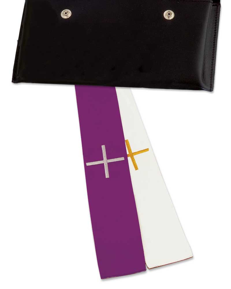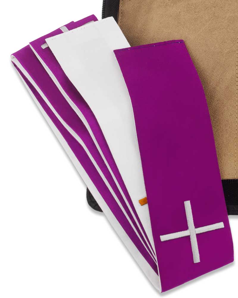Versehstola aus 100% Polyester, beidseitig zu tragen, weiß und violett, mit gesticktem Kreuzsymbol, 5cm breit, 160 cm lang.