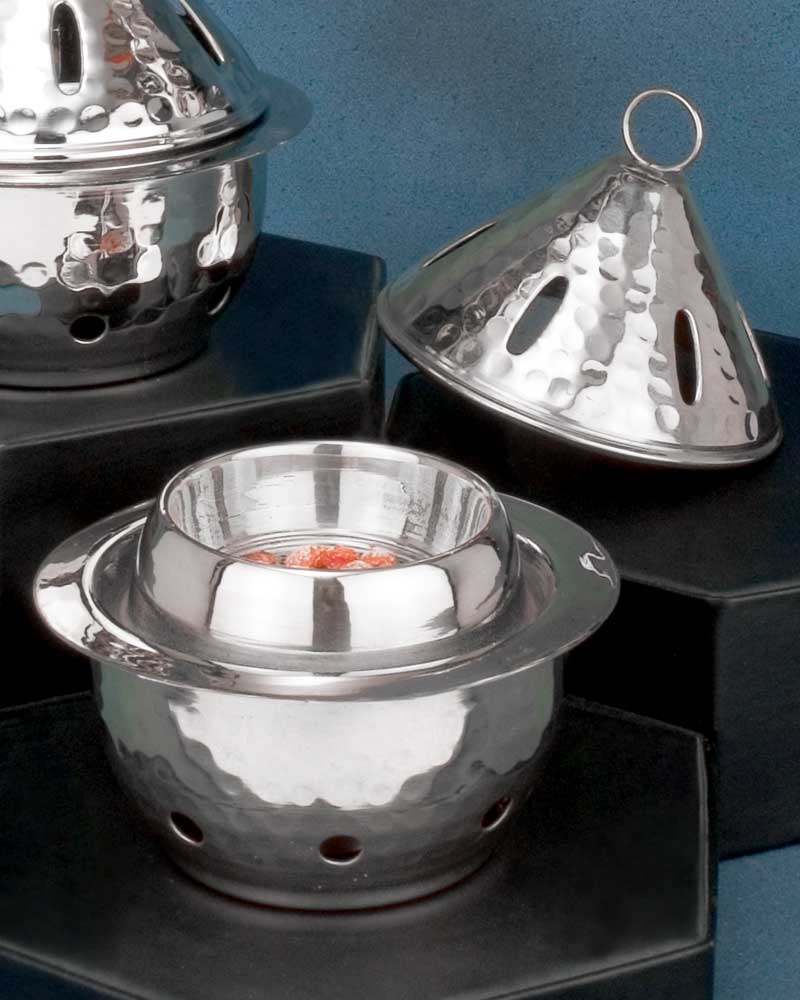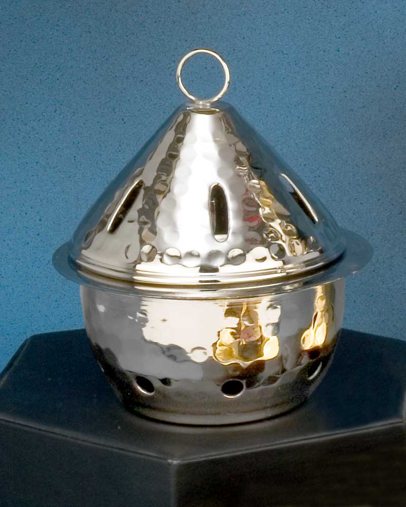 Standräuchergefäß mit gehämmerter Oberfläche, 12 cm Ø. Der Weihrauch wird auf ein Sieb gelegt unten mit einem Teelicht von unten zum Schmelzen gebracht. Ein Eigengeruch von Räucherkohle ist somit nicht vorhanden. Große Luftöffnungen sorgen für ausreichend Zirkulation. So lässt sich das Rächervergnügen langezeitig und dezent aufrecht erhalten oder auch mal kurz unterbrechen. Lieferung inclusive Teelicht.