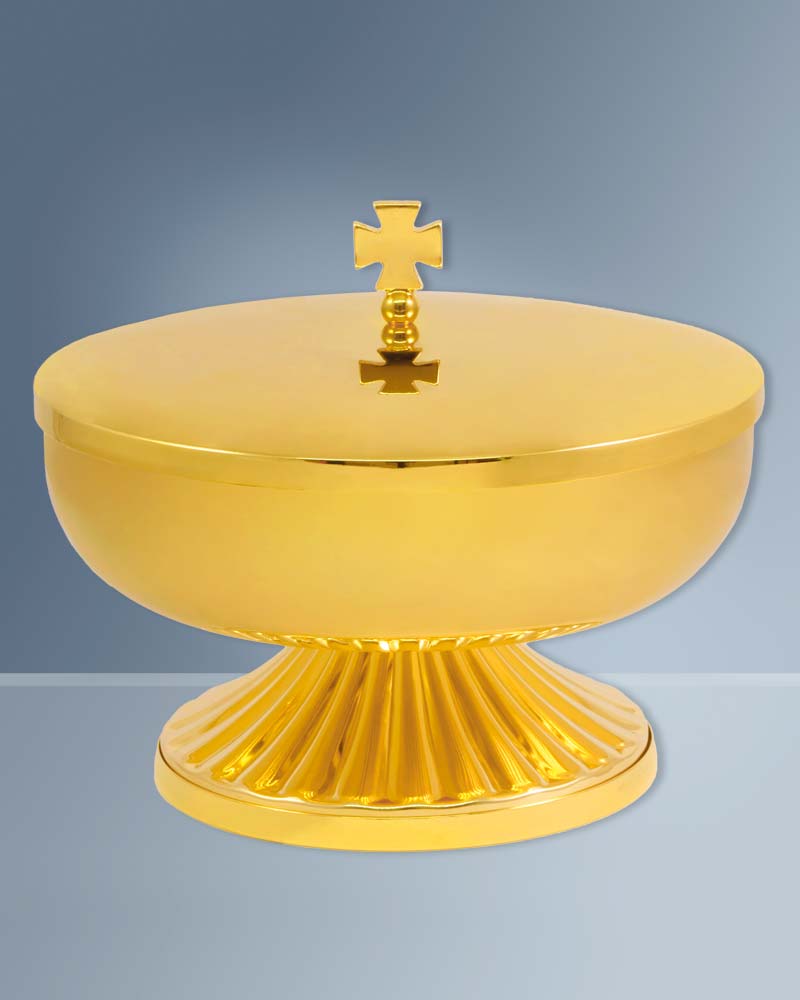 Dieses Ziborium ist eine hochwertige Handarbeit aus Messing, vergoldet. Die Gesamthöhe ist 10 cm, die Schale 14cm Ø ist mit bis zu 150 Brothostien befüllbar. Diese liturgischen Geräte zeichnen sich durch ein sehr gutes Preis-/Leistungsverhältnis aus.