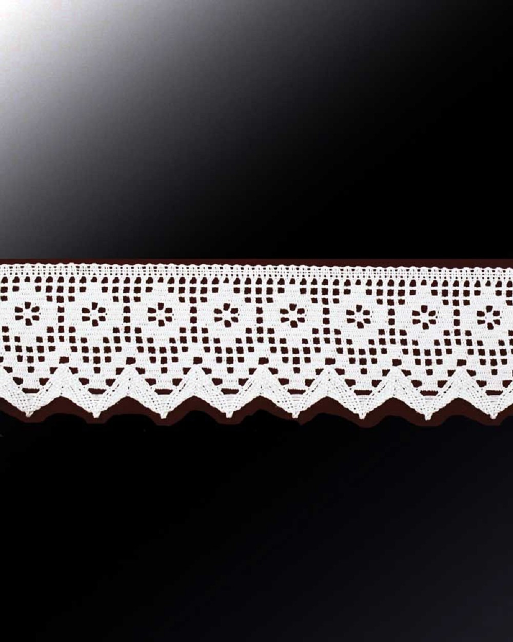 Maschinenspitze aus mercerisierter Baumwolle, 11 cm breit, Kreuzornamentik, Rapport 5 cm. Berücksichtigen Sie bitte bei Ihrer Bestellung, daß Baumwollspitze bis zu 10 % einlaufen kann. "Rapport" ist die Länge eines Musters. Im internet kann die Spitze nur meterweise bestellt werden. Abgeschnittene Meterware ist vom Umtausch ausgeschlossen. Haben Sie Fragen, so wenden Sie sich an unser fachkundiges Personal Tel. 089/74663060.