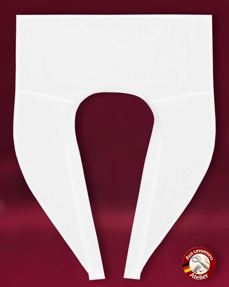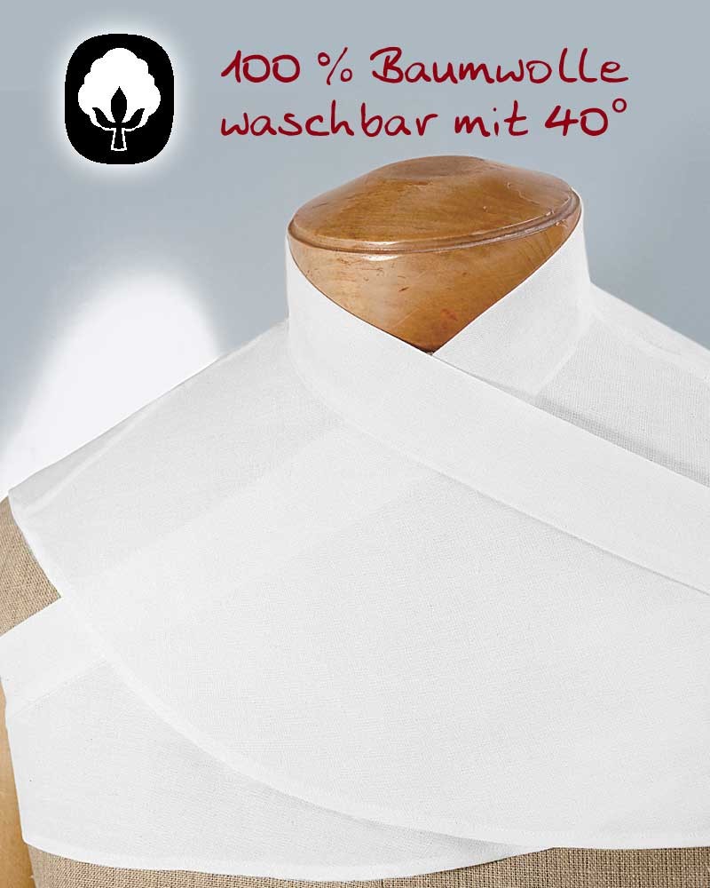 Das Schultertuch im Faconschnitt aus 100% Baumwolle wird mit einem Lochgummi auf die gewünschte Weite geknöpft.