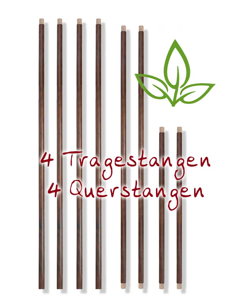 Baldachingestänge mit Bohrungen und Abfräsungen für Abschlussknöpfe, dunkelbraun gebeizt. 4 Tragestangen 2,4 m lang, 4 Querstangen 2 x 2,10 m lang, 2 x 1,55m lang, 3,5 cm Durchmesser