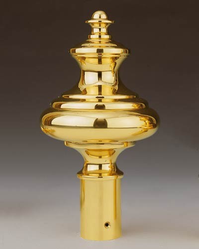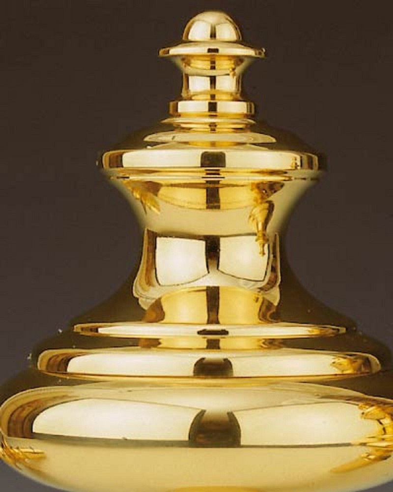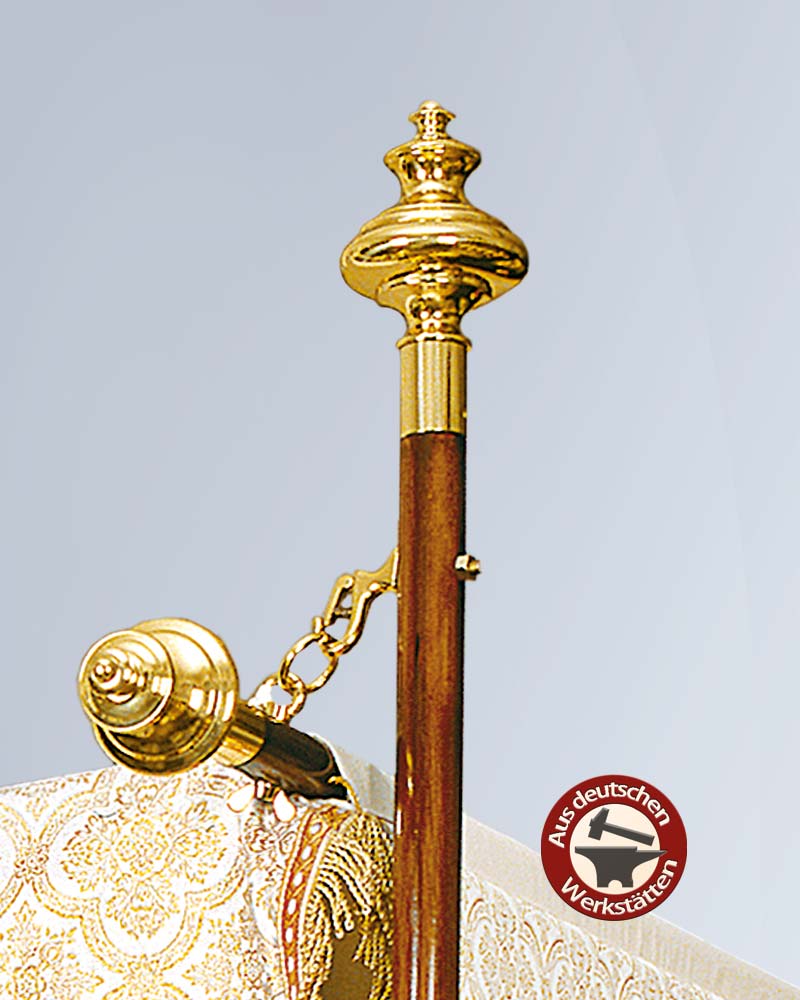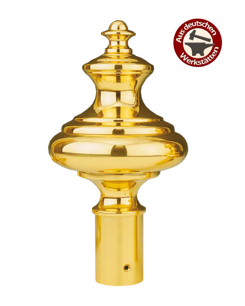 Abschlussknöpfe für Fahnen- und Baldachinstangen in barockem Design, Messing poliert und anlaufgeschützt. Zum Transportieren lassen sich die Köpfe von den montierten Schäften abschrauben. 100 mm Ø