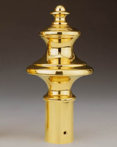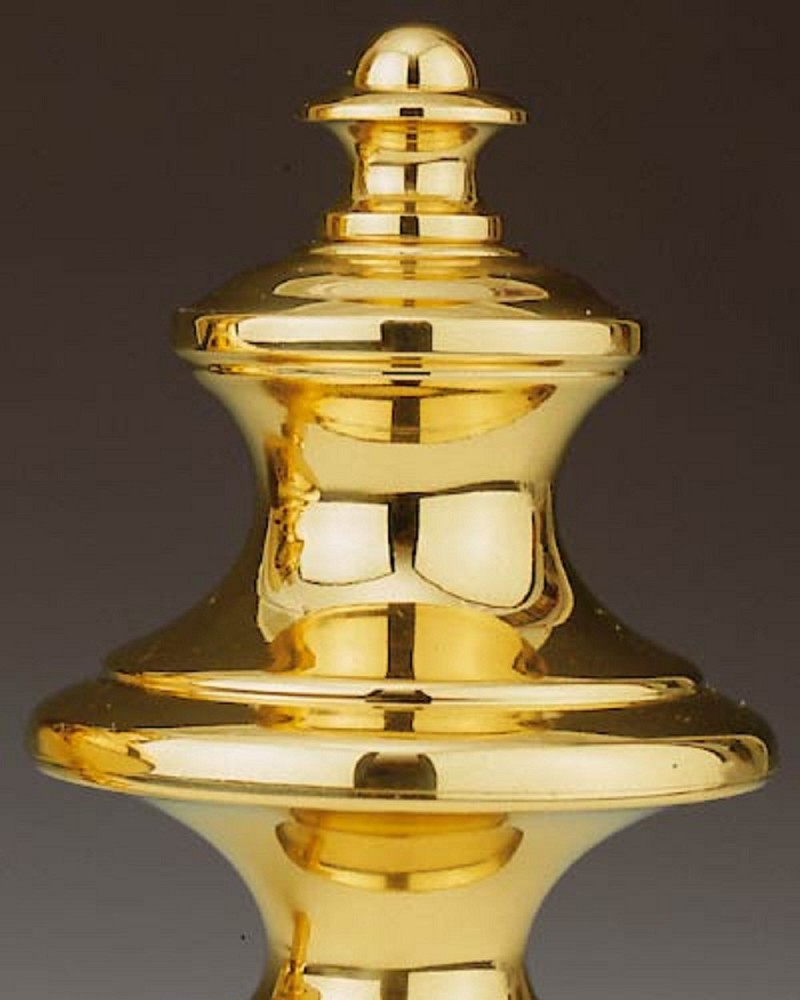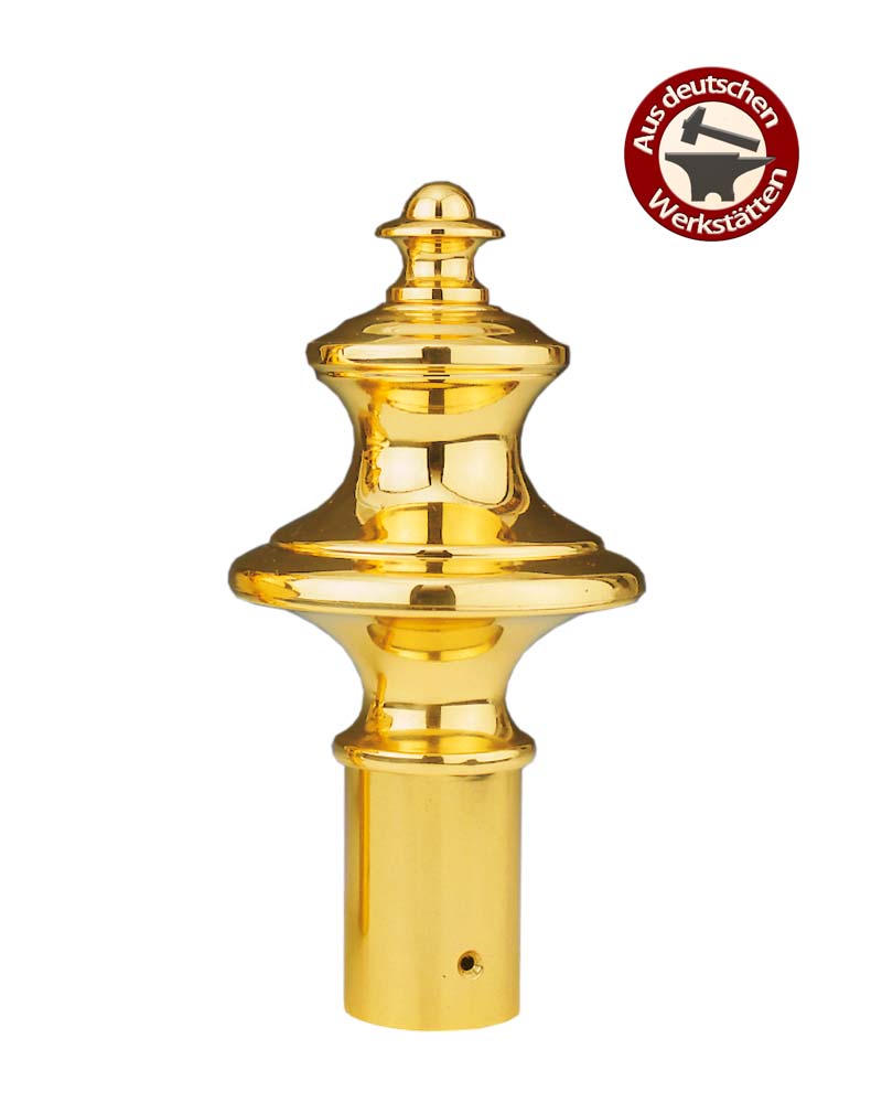 Abschlussknöpfe für Fahnen- und Baldachinstangen in barockem Design, Messing poliert und anlaufgeschützt. Zum Transportieren lassen sich die Köpfe von den montierten Schäften abschrauben. 80 mm Ø
