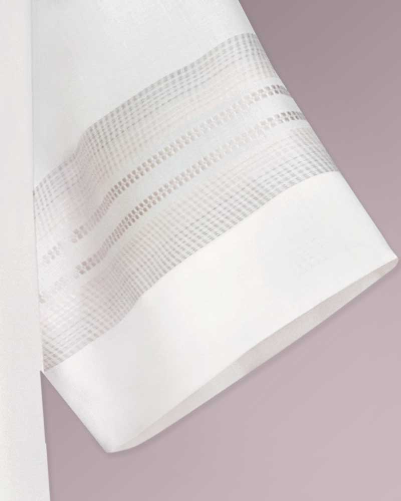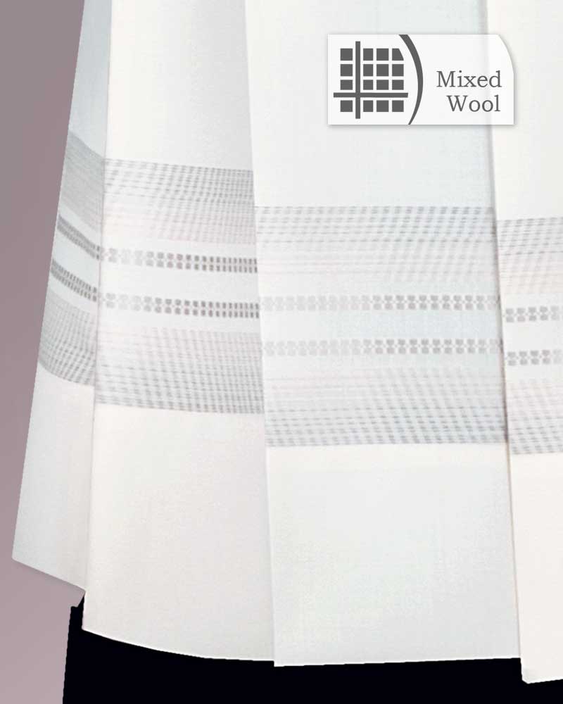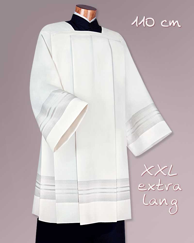 Chorrock aus cremefarbigem Paramentenstoff in 55% Polyester (Trevira) und 45% Wolle. Eine dezente, graue Einwebe ziert den Saum und die Ärmelabschlüsse. Hochwertige Konfektion mit weiten Ärmeln, +110 cm lang.