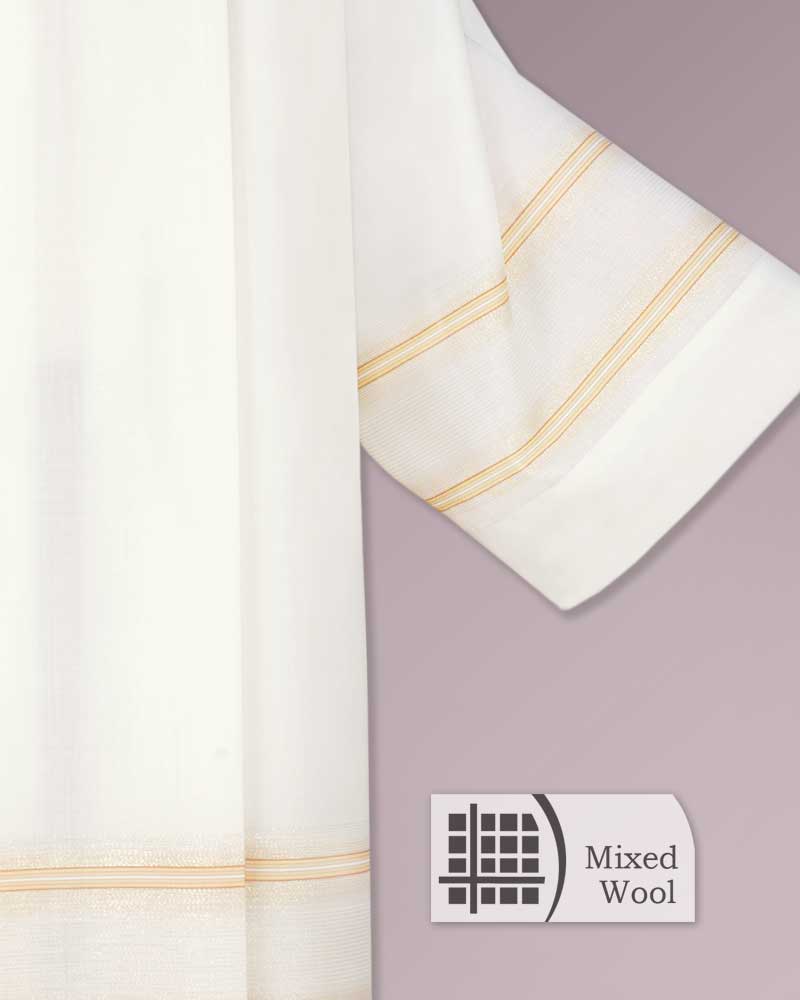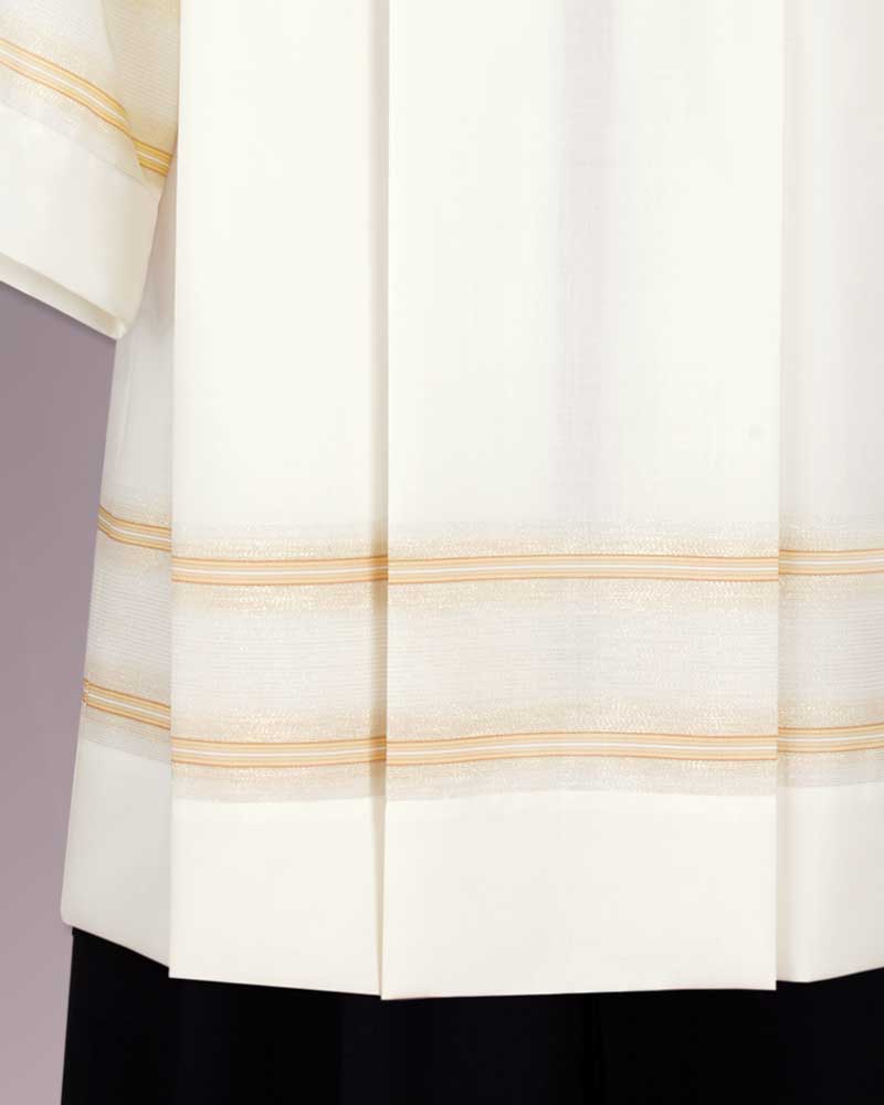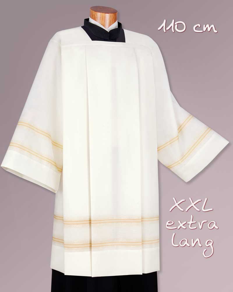 Chorrock in extra Länge, 110 cm, aus strapazierfähigem und knitterarmen Mischgewebe in 55% Polyester und 45% Schurwolle. Ein dezentes Goldstreifendekor ist als Ärmelabschluss und im Saum in den Paramentstoff eingewebt.