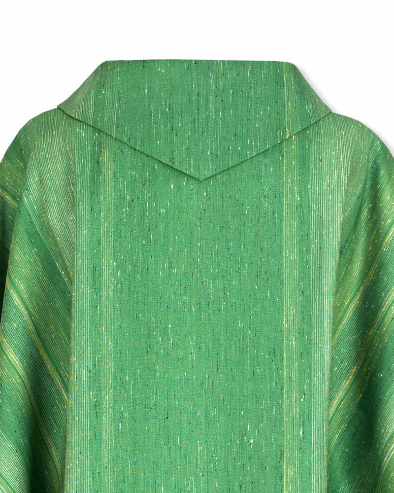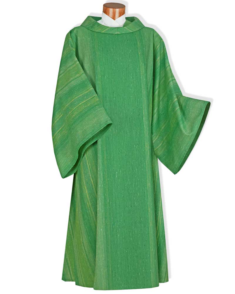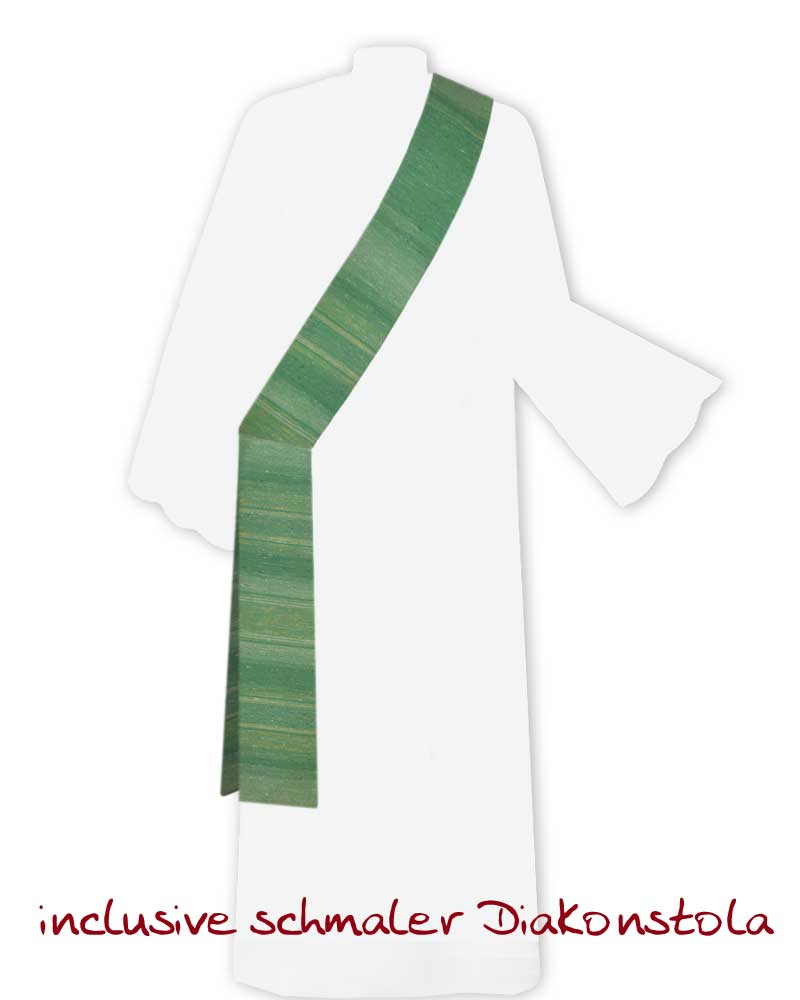 Dalmatik mit Streifeneinwebe und umgelegtem Kragen. Hoher Tragekomfort durch leichten, atmungsaktiven Paramentenstoff, aus 50 % Wolle, 25 % Seide, 25 % Viskose, 125 cm lang, 145 cm breit. Inklusive Facon geschnittener Diakonstola, mit eingewebtem Streifendekor.