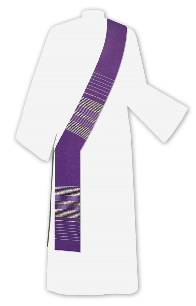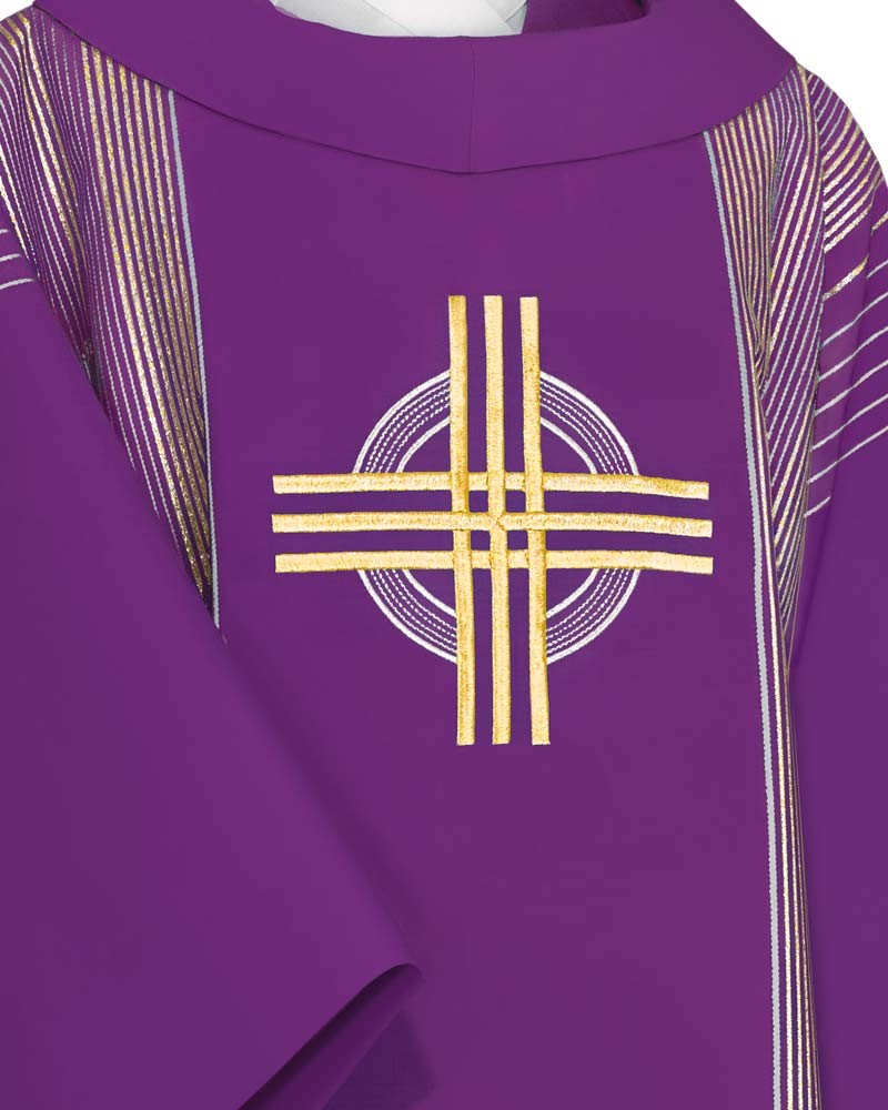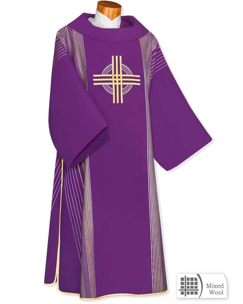 Dalmatik "Salvator Mundi", mit eingewebtem Streifendekor und gesticktem Kreuzsymbol. Paramentenstoff mit hohem Tragekomfort, aus 94% Schurwolle und 6% Metallfäden. Konfektion inklusive Diakonstola, mit kleidsamem Rundkragen, 122 cm lang und 155 cm breit.