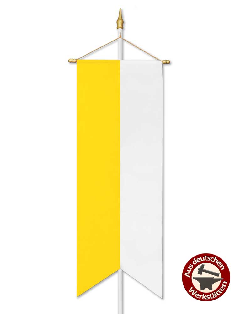Prozessionsfahnen aus strapazierfähigem Baumwollstoff, gelb/weiß geteilt. Konfektion mit Hohlsaum und spitzen Fahnenenden, in hochwertiger Ausführung. Querstange mit goldbronzierten Eicheln und Aufhängeschnur. Qualität aus deutschen Werkstätten !