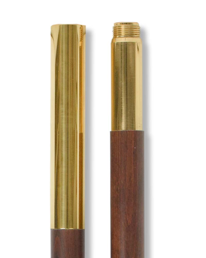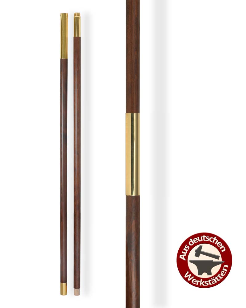 Fahnentragestange aus verweindungsfreihen Hartholz, braun gebeizt, 250 cm lang, 35 mm Durchmesser. Teilbar durch praktischen Schraubverschluß mit solidem Gewinde und Fahnenschuh aus Messing poliert und anlaufgeschützt.