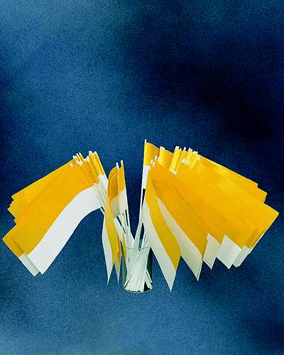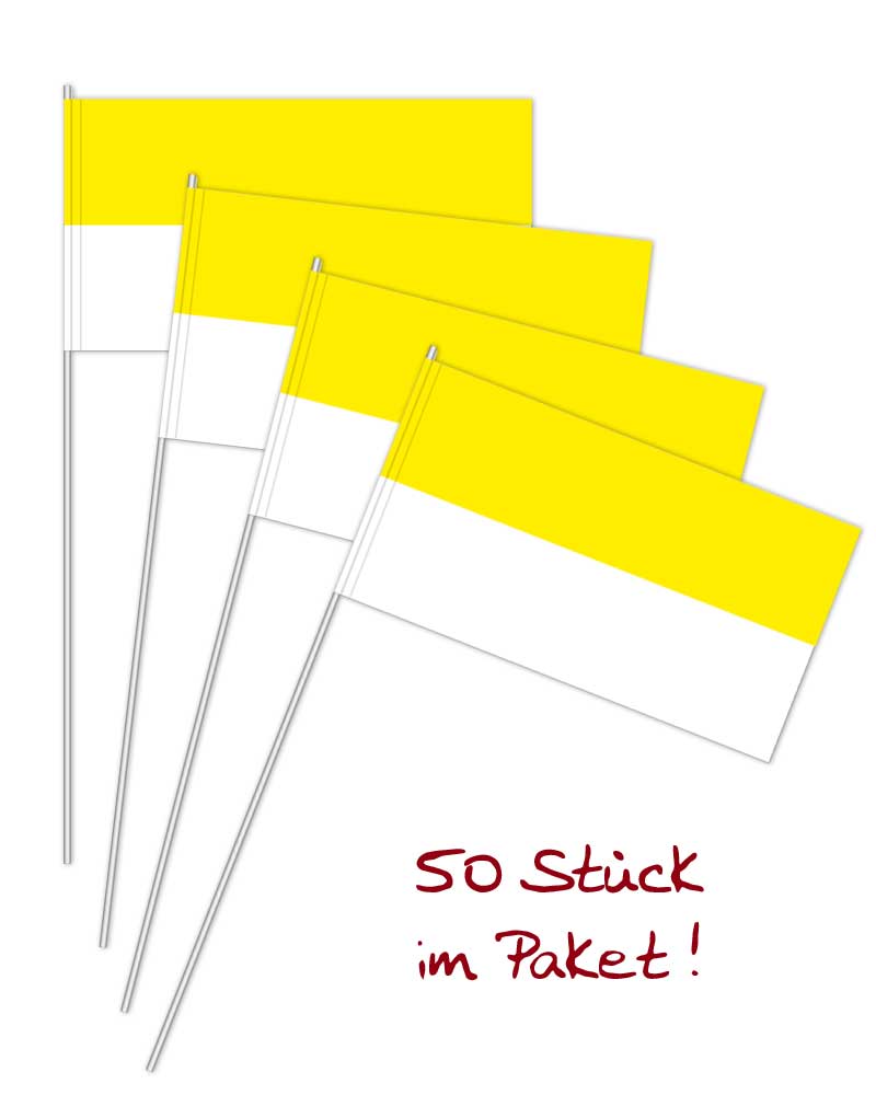 Papierfähnchen zweifarbig, gelb / weiß 12 x 24 cm, mit 40 cm langem Stab, 50 Stück im Pack.