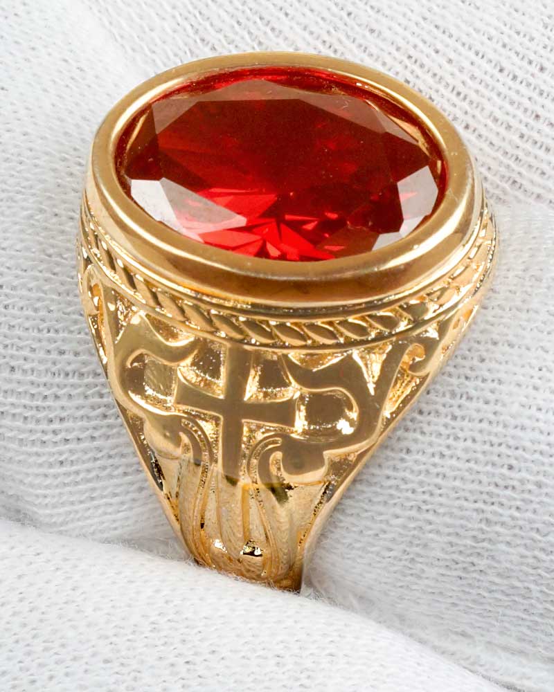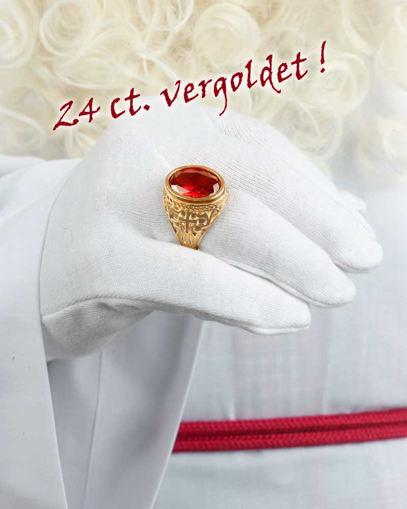 Dieser Bischofsring für Nikoläuse, ist eine Reproduktion nach einem alten Original in solider Messingausführung, 24 ct. vergoldet. Fertigung mit barockem Zierwerk und Kreuzornamentik, mit eingefasstem, facettiertem Glasstein. Der Nikolausring sollte um mindestens zwei Nummern größer bestellt werden, da er über den weißen Handschuhen getragen wird. Der Innendurchmesser von 21 mm passt für einen Finger bis 21 mm Druchmesser, dasa enstpricht einer Ringgröße von 66 mm (Umfang). Bitte Handschuh mitrechnen