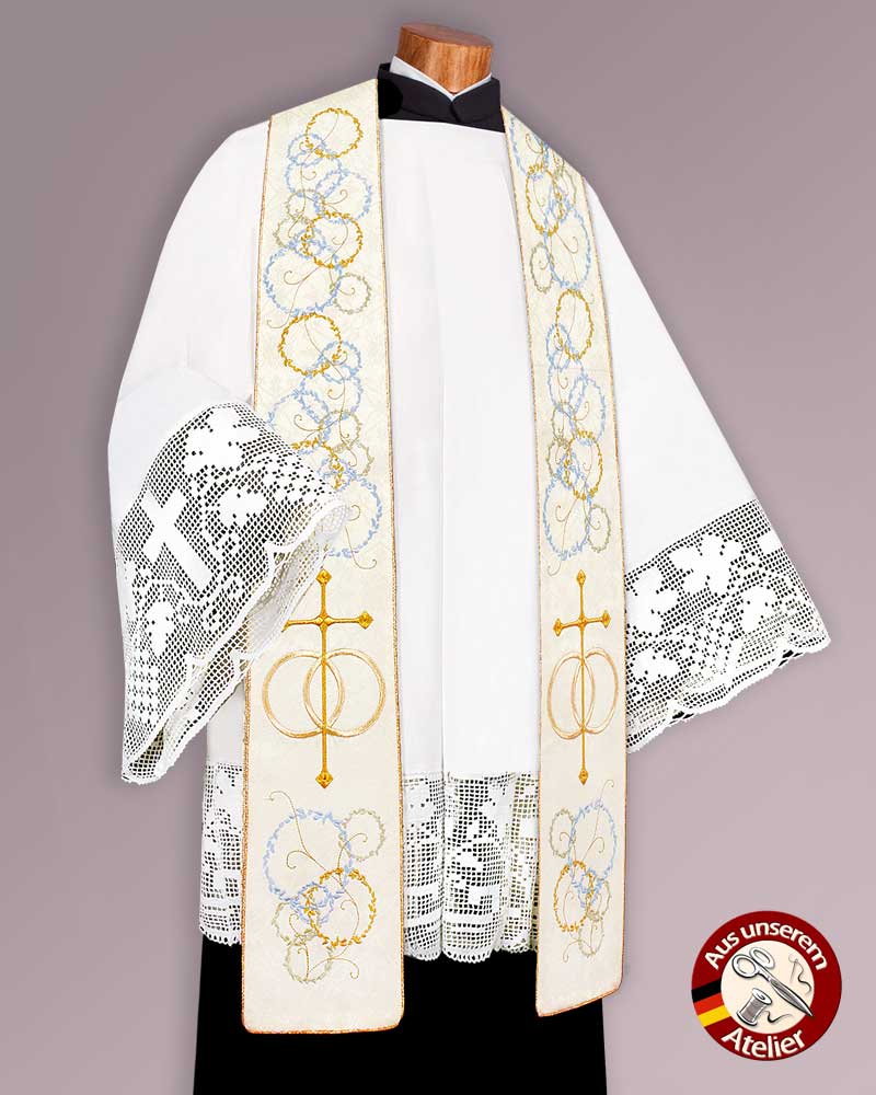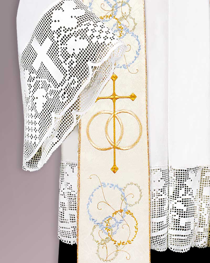 Hochzeitsstola aus cremefarbigem Damast in 100% Polyester, strapazierfähig und knitterarm. Filigrane Stickerei mit gold gesticktem Kreuz und Trauringen, 145 cm lang.