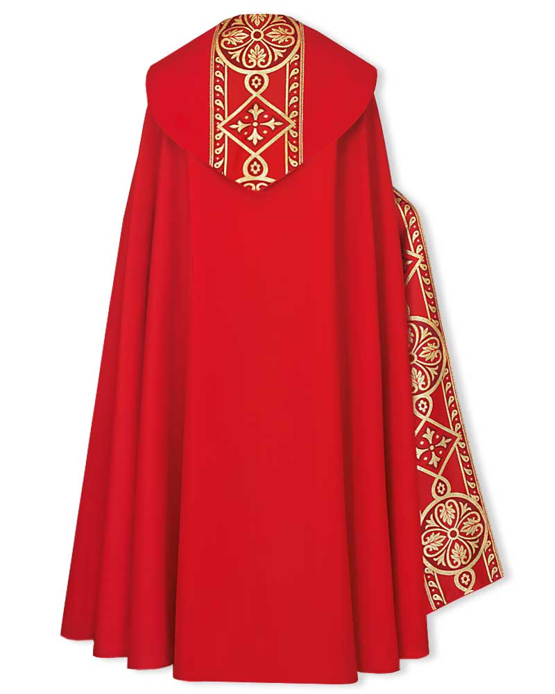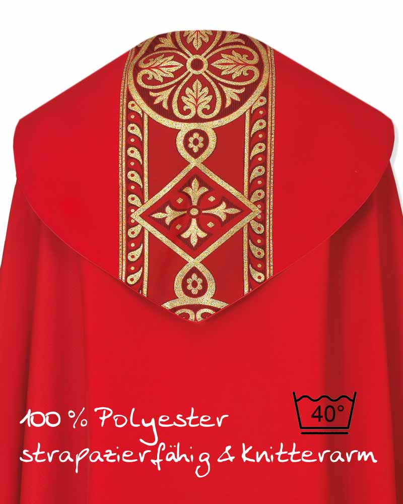 Nikolaus-Rauchmantel aus rotem, strapazierfähigen Paramentenstoff in barockem Design, 100% Polyester. Eine effektvolle rot/goldene Paramentenborte in Kreuzornamentik schmückt die Vorderseite und die große Kappa. Lieferumfang: Nikolausgewand 140 cm lang mit passender Innenstola. Einfache Reinigung durch Maschinenwäsche bis 40 Grad.