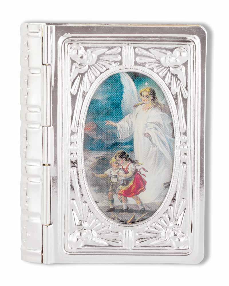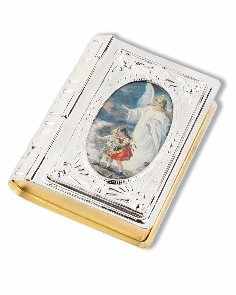 Diese Buchdosen sind Reproduktionen alter Originale. Sie wurden in hochwertiger Ausführung, in deutschen Werkstätten angefertigt. Die Frontplatte ist mit einem Scharnier aufzuklappen. Das oval gefasste Bildchen zeigt die Reproduktion eines Originals, Schutzengel mit 2 Kindern auf der Brücke. Die Oberfläche der Rosenkranzdose ist reliefiert und rückseitig mit einem schönen Kreuzdekor ausgeführt. Das Etui ist 62 x 48 x 15 mm groß und für Rosenkränze mit Perlen bis 5 mm Ø geeignet. Bitte beachten Sie: Lieferung ohne Rosenkranz! Passende Rosenkränze finden Sie in unserem Sortiment.