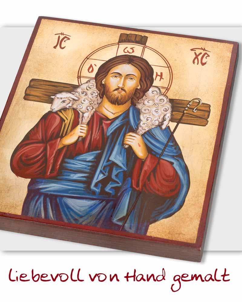 Die Ikone zeigt Jesus Christus Christus, als den guten Hirten, der ein Lamm auf den Schultern trägt. Diese Ikone wurde Liebevoll und detaileich von Hand gemalt und blattvergoldet, 31 x 22 cm, mit schönem Aufbewahrungs und Geschenketui.