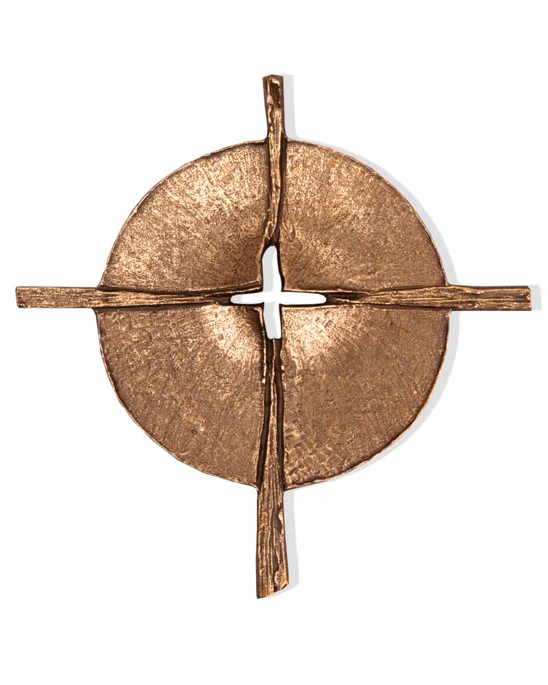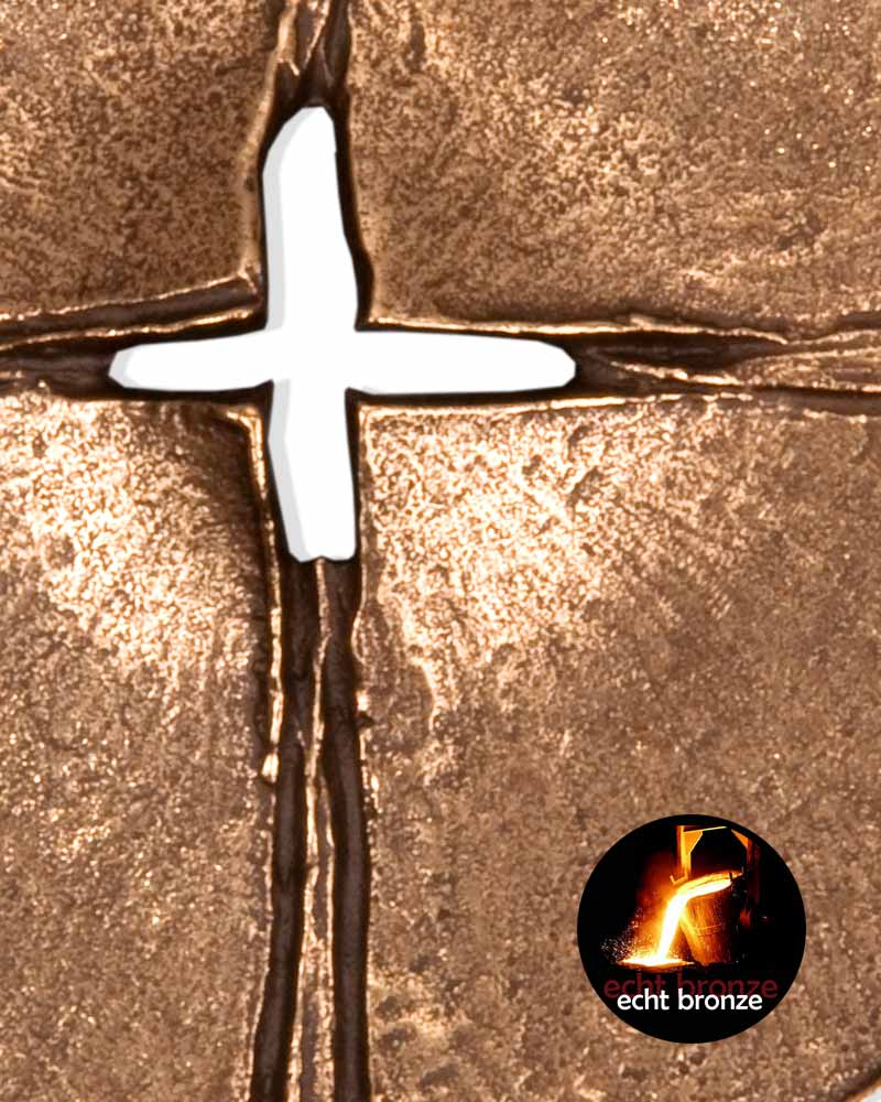 Wandkreuz aus Bronze, pantiniert, 17 x 17 cm. Kreuzscheibe im Zentrum durchbrochen. Rückseitig mit Aufhängemöglichkeit zur Wandbefestigung. Handarbeit aus deutscher Bronzegießerei.