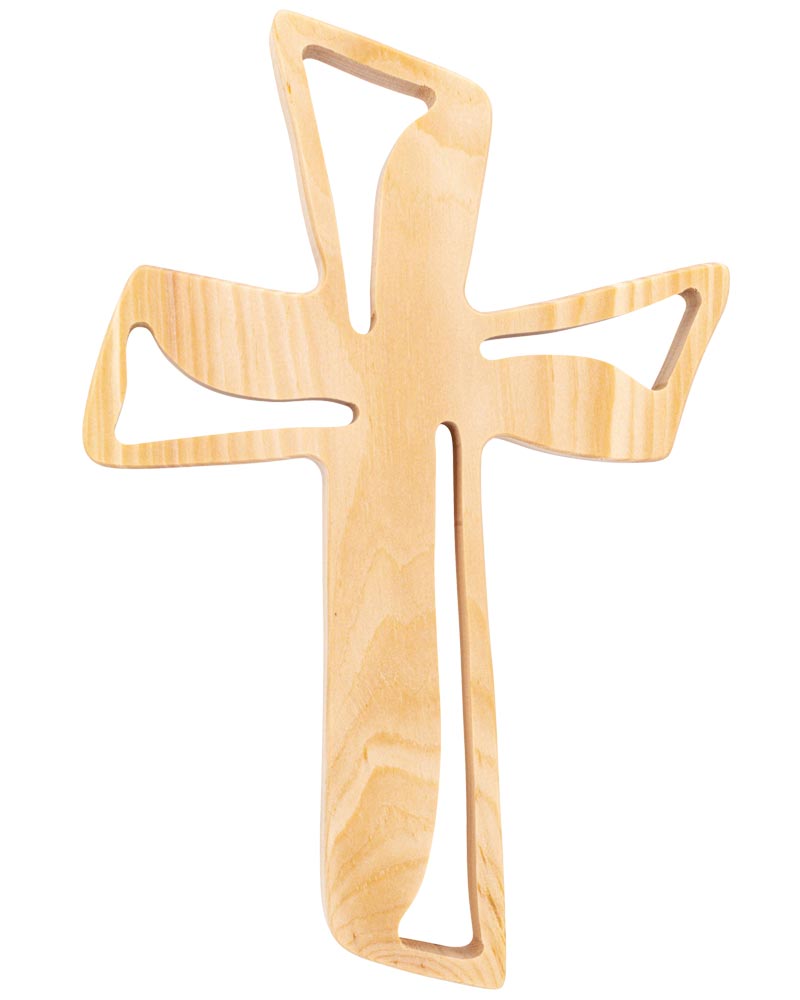 Wandkreuz aus naturbelassenem Zirbenholz, handgefertigt in Tirol. Maße: 21 × 13,5 × 1,3 cm. Die Oberfläche zeigt natürliche Äste und individuelle Maserung – jedes Kreuz ist ein Unikat. Die Ecken sind diagonal und unregelmäßig durchbrochen. Diese offene Gestaltung verleiht dem Kreuz Tiefe und Leichtigkeit. Die lebendige Struktur des Holzes und der Verzicht auf Lackierung betonen die Ursprünglichkeit des Materials. Zur Aufhängung geeignet. Ideal für private Andachtsräume oder als schlichtes Gestaltungselement im sakralen Kontext.