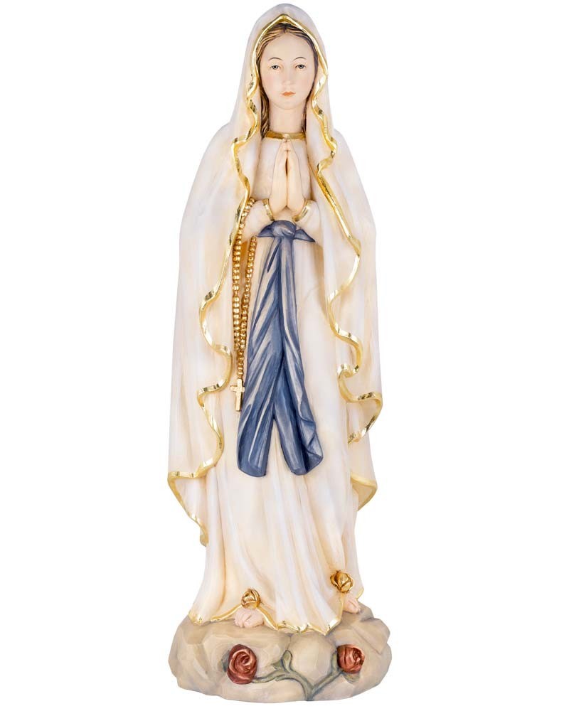 Lourdesmadonna, die Hände zum Beten gefaltet, mit blauem Schurz und gold kolorierten Ränder ihres Gewandes. Liebevoll aus Lindenholz geschnitzt und von Hand koloriert, 30 cm hoch.