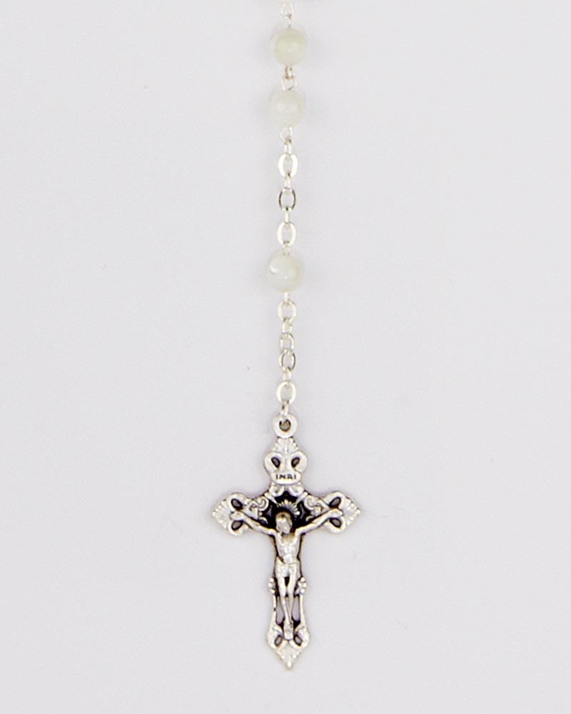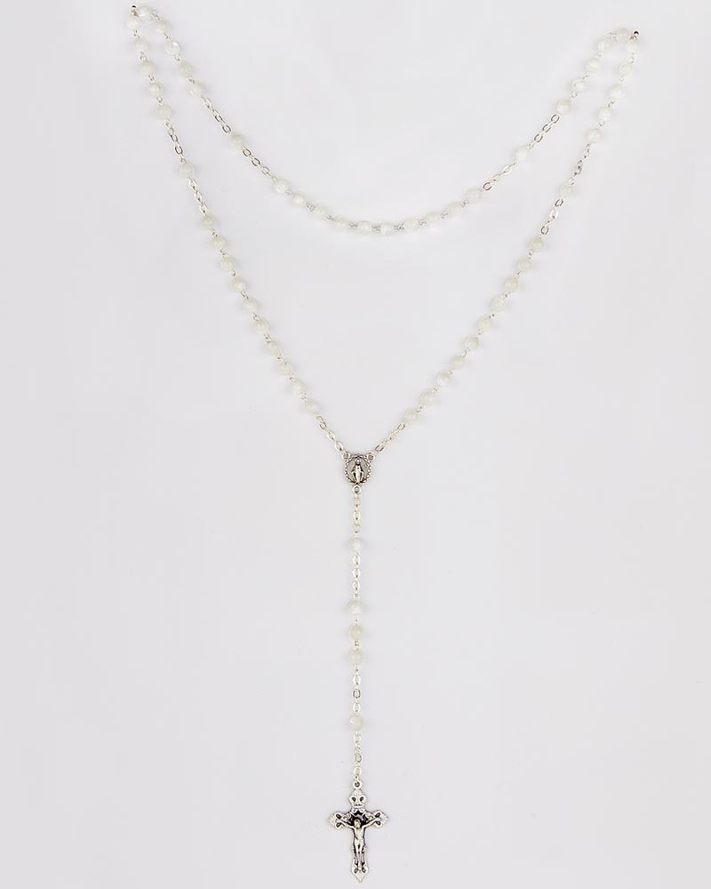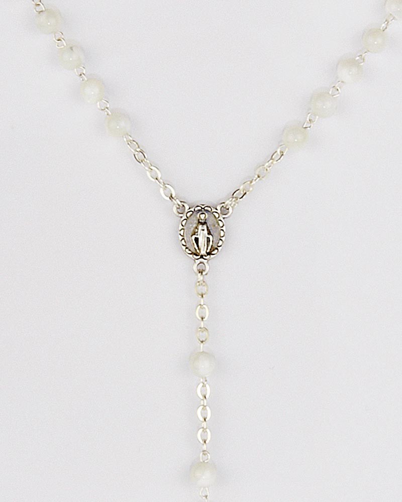 Rosenkranz aus imitierten weißen Wasserperlen Kreuz 4 cm, 40 cm lang, 6 mm Ø runde Perlen. Das Herzstück mit Mariendarstellung zeigt die Erscheinung von Lourdes. Das Kruzifix ist in einem minimalistischem, klassischen Design gestaltet.