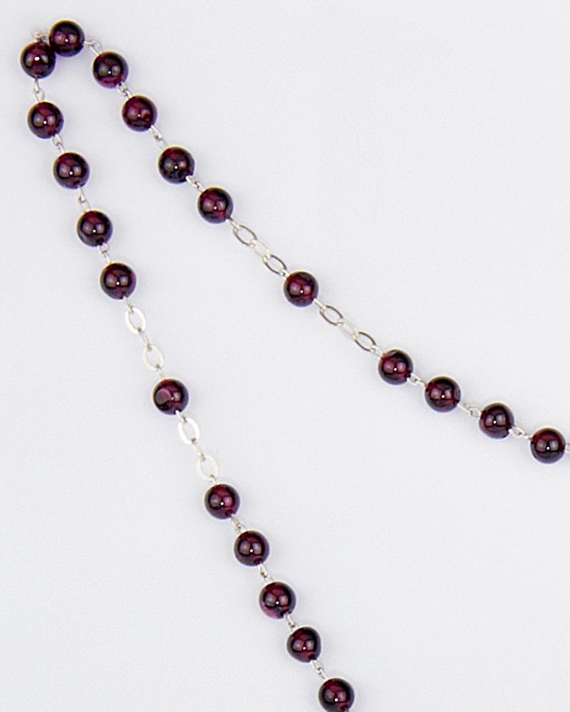 Rosenkranz mit echten Natursteinperlen aus Granat 4 mm Ø, Gesamtlänge 40cm. Solide, gekettelte Ausführung aus 925 Sterling Silber. Das Herzstück mit Mariendarstellung zeigt die Erscheinung von Lourdes. Das Kruzifix ist in einem minimalistischem, innovativem Design gestaltet.