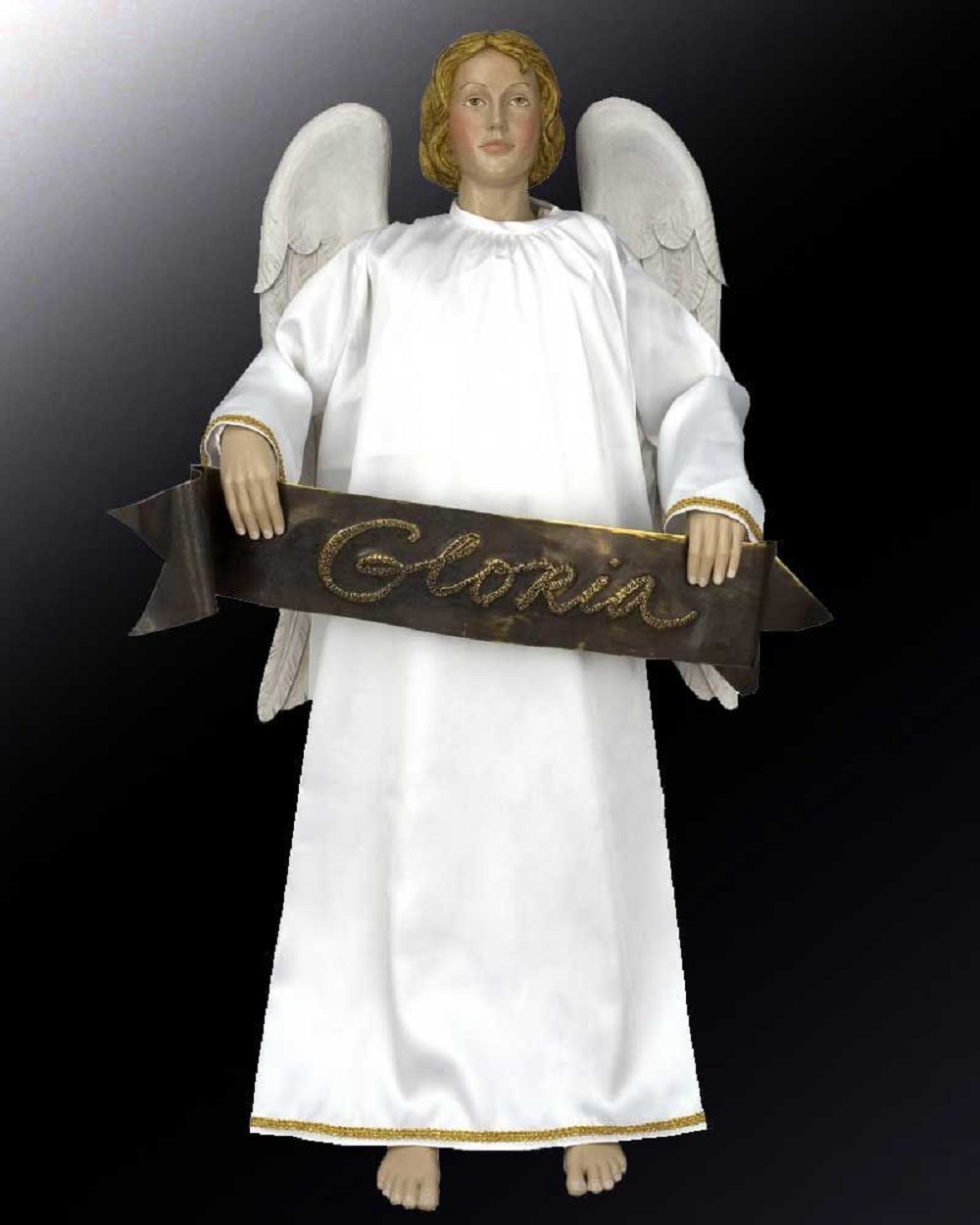 Verkündigungsengel mit geschnitzten Flügeln, Schriftband „Gloria“ aus ziseliertem Messing, patiniert.