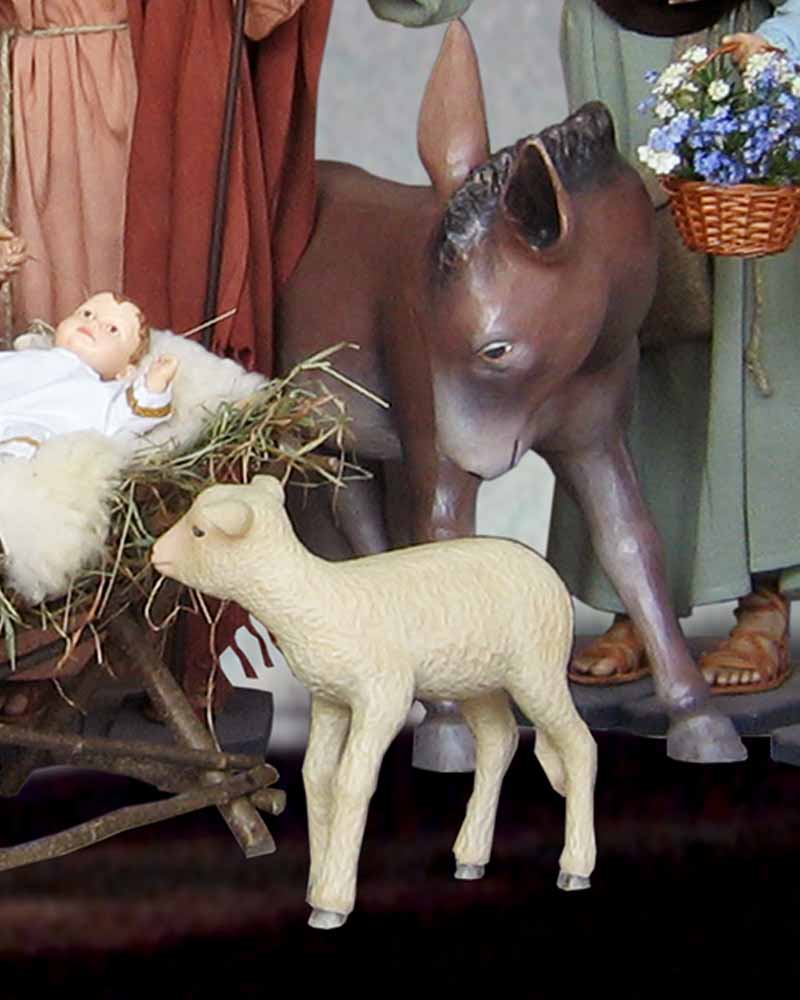 In alter Tradition befinden sich in Kirchen Krippenfiguren mit beweglichen Körpern und handgeschnitzten Gliedmaßen. Mit dieser Krippe möchten wir diese Tradition fortsetzen, und bieten Ihnen hochwertige Handwerkskunst mit liebevoller Detailarbeit. Die Körper wurden von einem Schreiner angefertigt - komplett von Hand geschnitzt und coloriert. Lamm stehend - passend zu 180 cm-Figuren