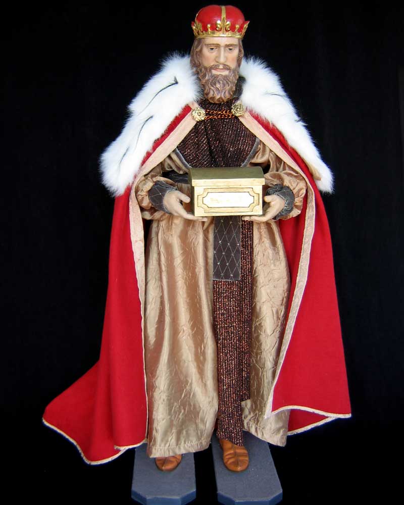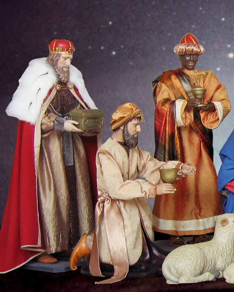 Hl. Drei Könige in Lebensgröße, für Ankleidekrippe. Die vollbeweglichen Gliederpuppen sind mit handgeschnitzten Köpfen und Gliedmaßen gearbeitet. Liebevoll im Detail gearbeitete Bekleidung und Accessoires für Weihrauch, Gold und Myrrhe gehören zum Lieferumfang, 180 cm hoch. Der passende Schraubenschlüssel zum feststellen der beweglichen Glieder wird mitgeliefert. 120 cm
