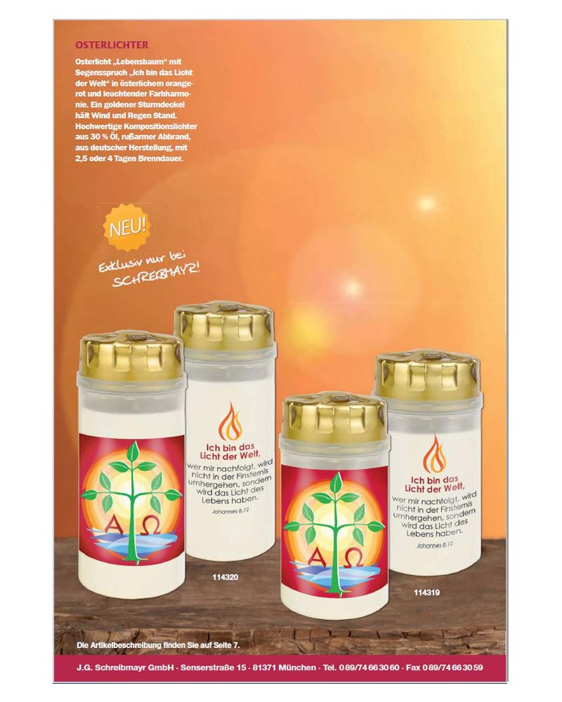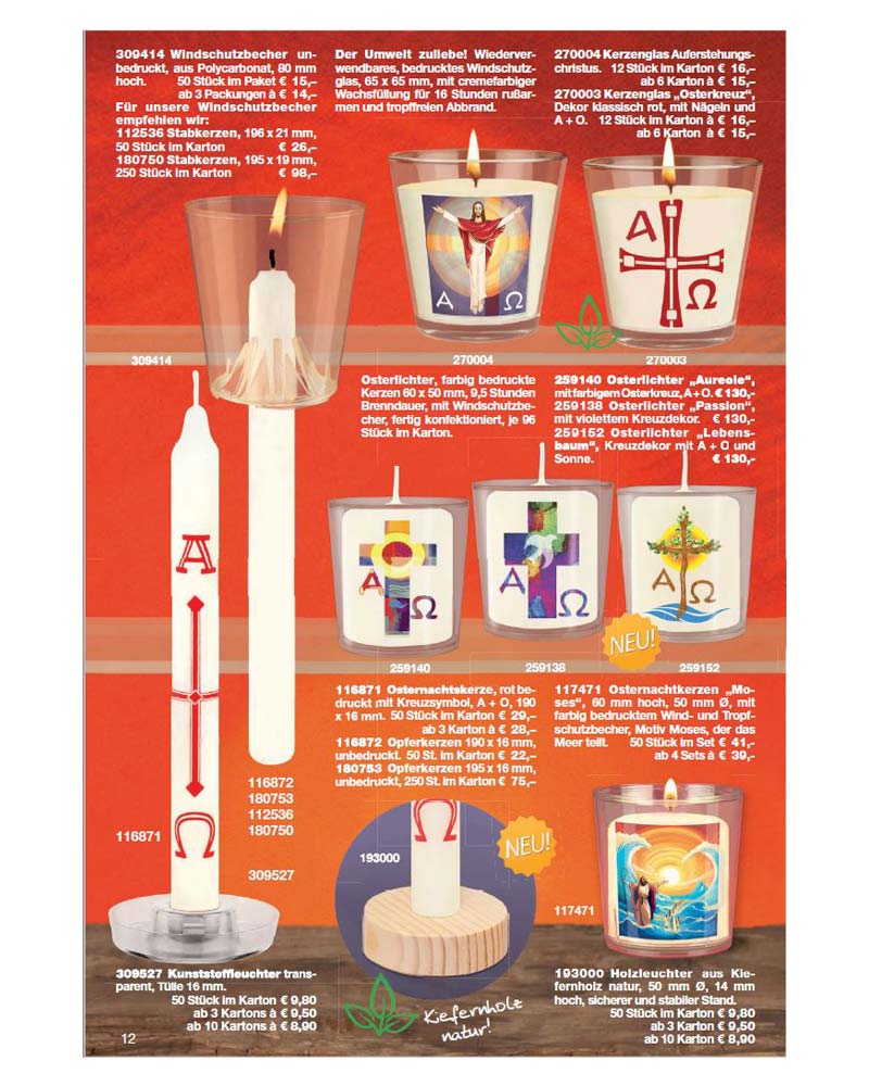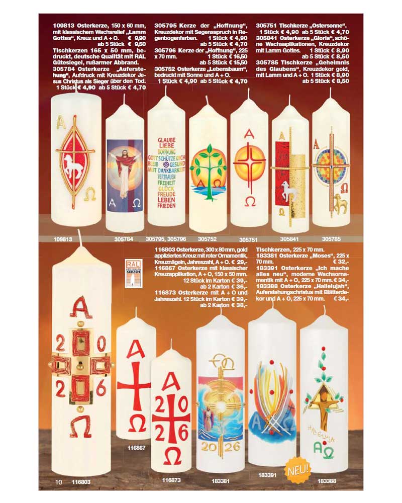 Ostern ist das wichtigste Ereignis im Kirchenjahr. In unserem neuen Prospekt erwartet Sie eine große Auswahl an liebevoll, verzierten Osterkzen für die Kirche und kleine, preisgünstige Tischkerzen für zu Hause. Auch den passenden Osterleuchter für die Kirche, werden Sie darin finden. Die beliebten Bronzekreuze und Andenken für die Erstkommunion dürfen natürlich nicht fehlen.
