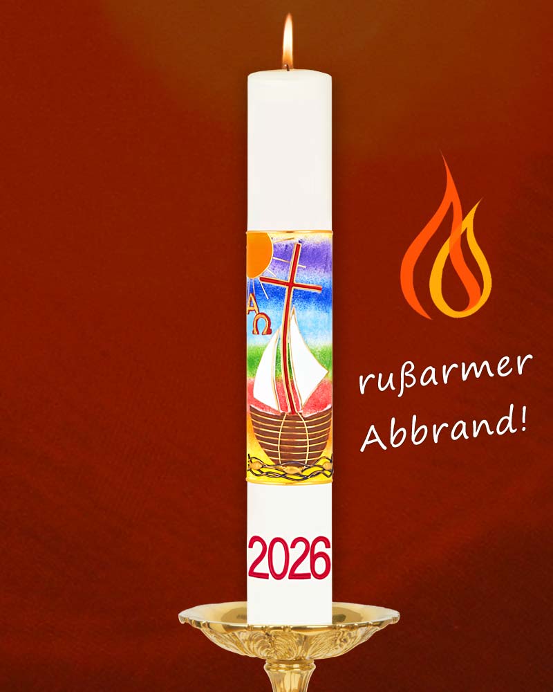 Osterkerze mit Schiff, als Symbol für die Gemeinschaft, Kreuzdekor und A + O mit farbigem Hintergrund (ohne Kreuznägel). Diese Osterkerze ist in zeitgemäßer schöner Ausführung, gefertigt und verziert in deutschen Wachsziehereien. Ceresin mit 10% Bienenwachs für rußfreien Abbrand.