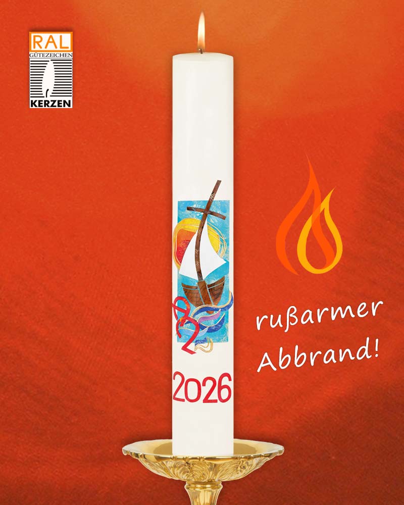Osterkerze "Ein Schiff, dass sich Gemeinschaft nennt", A + O und Jahreszahl. Diese Osterkerze ist eine hochwertige Arbeit aus deutscher Wachszieherei, mit 10 % Bienenwachs. Detailreich und liebevoll gestaltet, in beeindruckend schöner Ausführung.