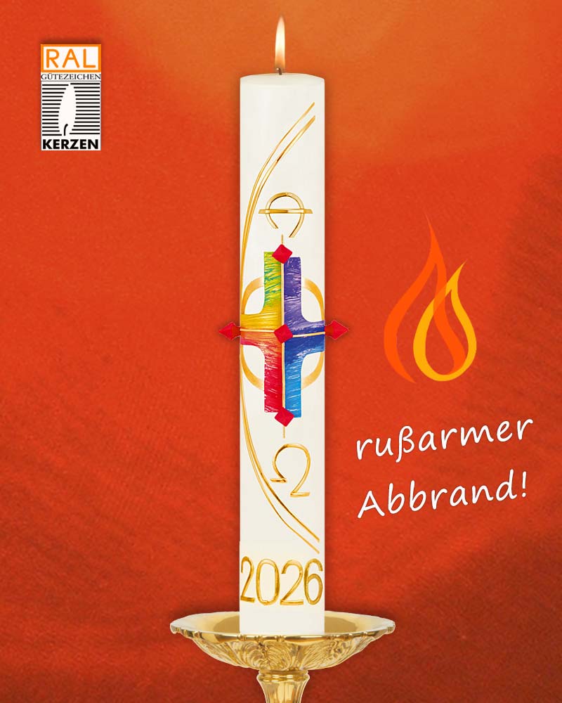 Osterkerze mit appliziertem Kreuzdekor in vier liturgischen Kirchenfarben. Goldene Konturen mit A + O und Jahreszahl, mit vorgebohrten Löchern für Nägel. Diese Osterkerze ist eine hochwertige Arbeit aus deutscher Wachszieherei, mit 10 % Bienenwachs. Detailreich und liebevoll gestaltet, in beeindruckend schöner Ausführung.
