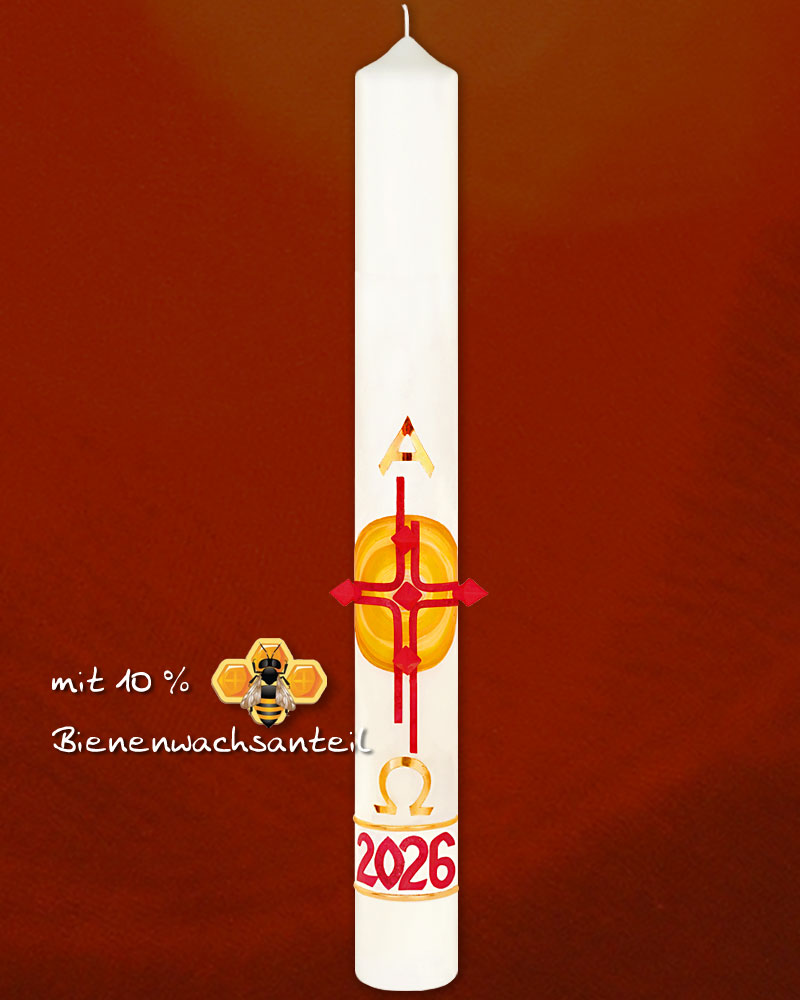 Osterkerze mit aufgehender Ostersonne in goldenem Farbverlauf, Kreuzkonturen und Jahreszahlen in dunkelrot, A + O gold appliziert, inkl. Kreuznägel. Diese Osterkerze ist eine hochwertige Arbeit aus deutscher Wachszieherei, mit 10 % Bienenwachs. Detailreich und liebevoll gestaltet, in beeindruckend schöner Ausführung.