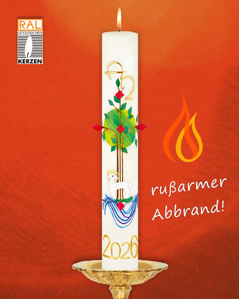 Osterkerze, mit filigranem Lebensbaumdekor, Lamm Gottes und Wassersymbolik. Die beiliegenden Kreuznägel, lassen sich einfach in die vorgebohrten Löcher einstecken. Diese Osterkerze ist eine hochwertige Arbeit aus deutscher Wachszieherei, mit 10 % Bienenwachs. Detailreich und liebevoll gestaltet, in beeindruckend schöner Ausführung.