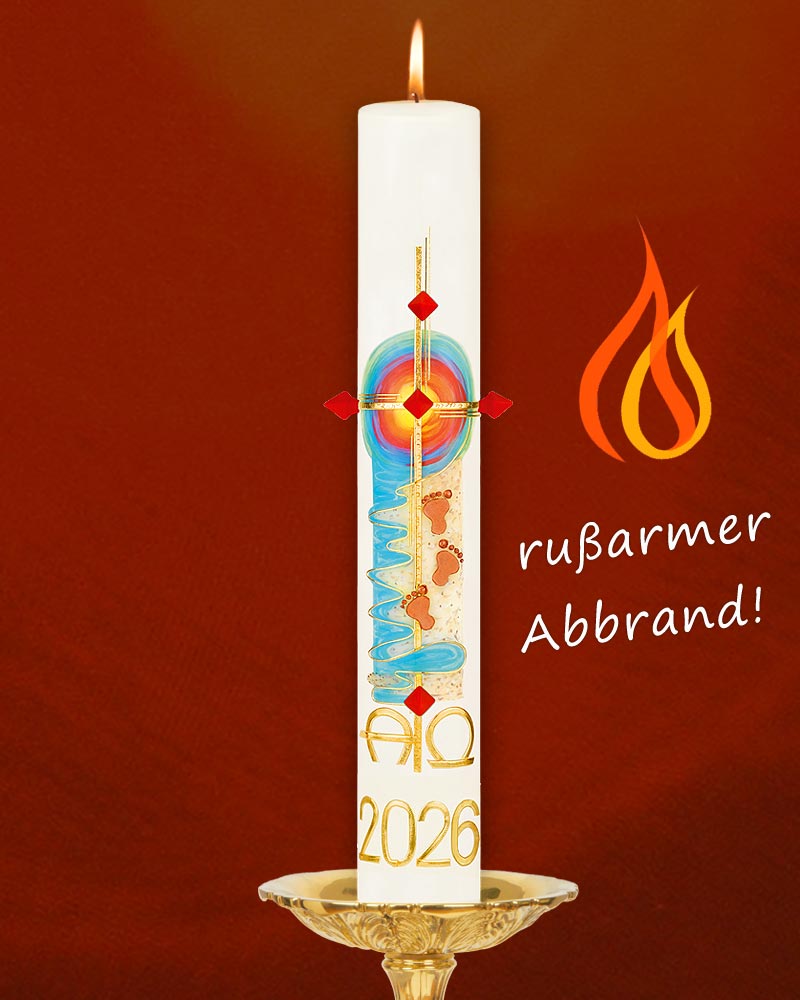 Liebevoll von Hand verzierte XXL - Osterkerze in hochwertiger Kirchenkerzenqualität mit 10% Bienenwachs. Kreuz mit einsteckbaren Nägeln, A+O und Jahreszahl. Die Kerze ziert die Darstellung Spuren im Sand.