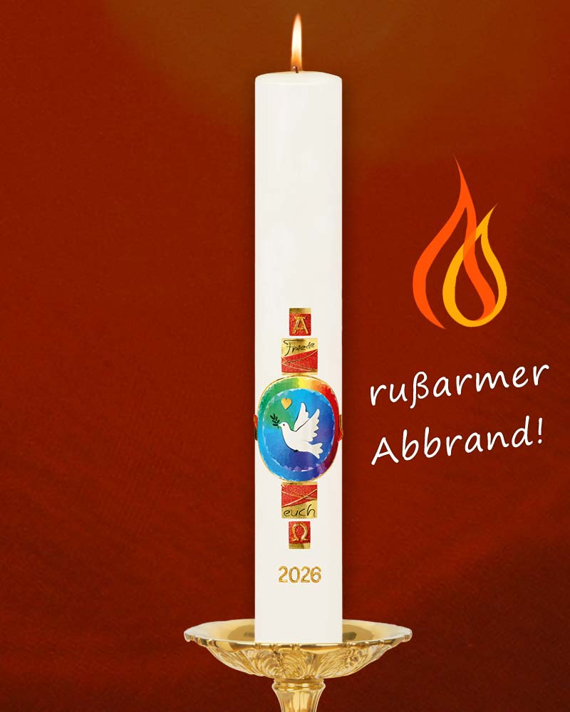 Liebevoll von Hand verzierte Osterkerze 600 x 80 mm in hochwertiger Kirchenkerzenqualität mit 10% Bienenwachs. Die Kerze ziert eine schöngestaltete weiße Taube mit wellenförmigen Flügeln und einem Olivenzweig im Schnabel auf einem regenbogenfarbigem Kreissymbol mit kleinem goldenem Herz. Gerahmt von den goldroten Textblöcken A/O und Friede sei mit Euch und der Jahreszahl.