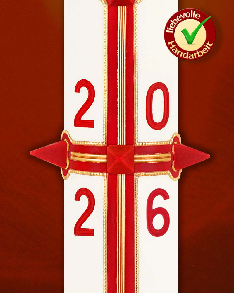 Osterkerze 800/80 mm, Klassik, Kreuz mit Jahreszahl, rot / gold, A+O, mit Nägeln, mit Jahreszahl.