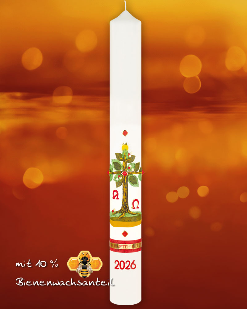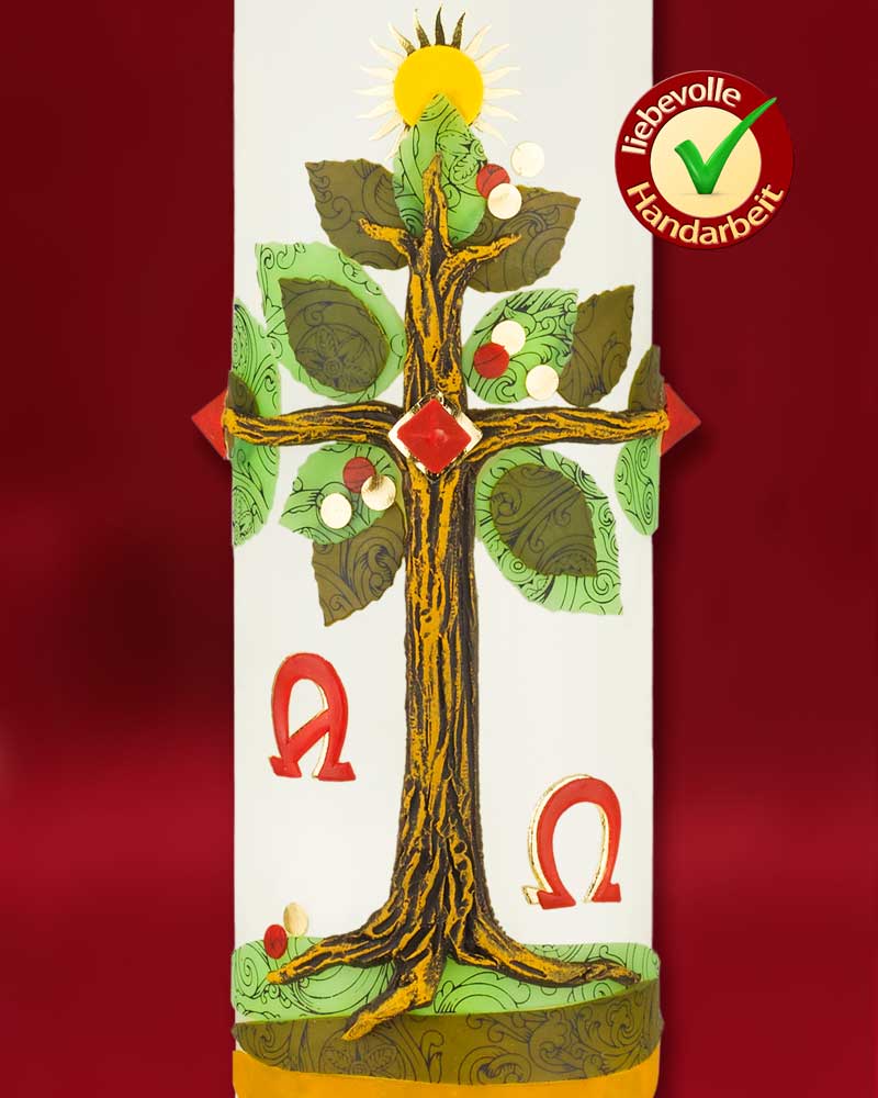 Osterkerze 800 x 80 mm Lebensbaum mit Sonne, mit Jahreszahl und Nägeln, A + O "Ich bin die Auferstehung"