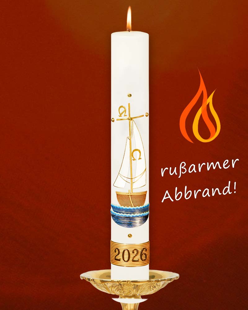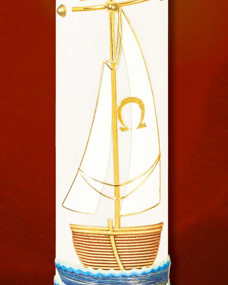 Liebevoll von Hand verzierte Osterkerze 800 x 80 mm in hochwertiger Kirchenkerzenqualität mit 10% Bienenwachs. Die Osterkerze ziert ein Schiff mit einem Kreuz als Mast. Das Schiff steht für die Gemeinschaft der Kirche auf der Reise zu Gott. Der Mast des Schiffes ist ein Zeichen für das Kreuz von Christus, es steht für Hoffnung und spendet Trost und Kraft.