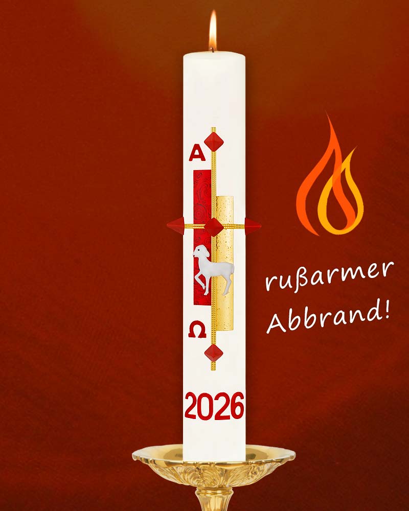 Die Osterkerze „Gloria“ (600 × 80 mm, ca. 2500 g) beeindruckt mit ihrer edlen Gestaltung in Rot und Gold. Ein goldenes Kreuz, umgeben von filigranen Wachsornamenten, steht im Mittelpunkt des Designs. Das Lamm Gottes symbolisiert Christus, der sich für die Erlösung der Menschen geopfert hat – ein zentrales Zeichen des Osterfestes. Die roten und goldenen Details verleihen der Kerze eine festliche Ausstrahlung. Mit einer durchschnittlichen Brenndauer von ca. 347 Stunden sorgt sie über viele Stunden hinweg für warmes, stimmungsvolles Licht.