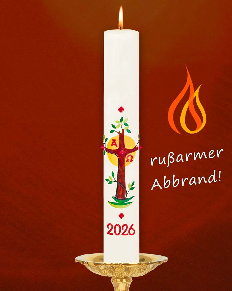Osterkerze „Lebensbaum“ mit aufgehender Ostersonne, Jahreszahl und A + O. Farbenfrohe Wachsapplikationen von rot bis gelb und grün bis blau, in zeitgemäßem Design. Hochwertige Kerzenqualtität aus deutschen Werkstätten, mit 10% Bienenwachs. Jedes Stück ein Unikat, liebevoll mit Hand verziert.