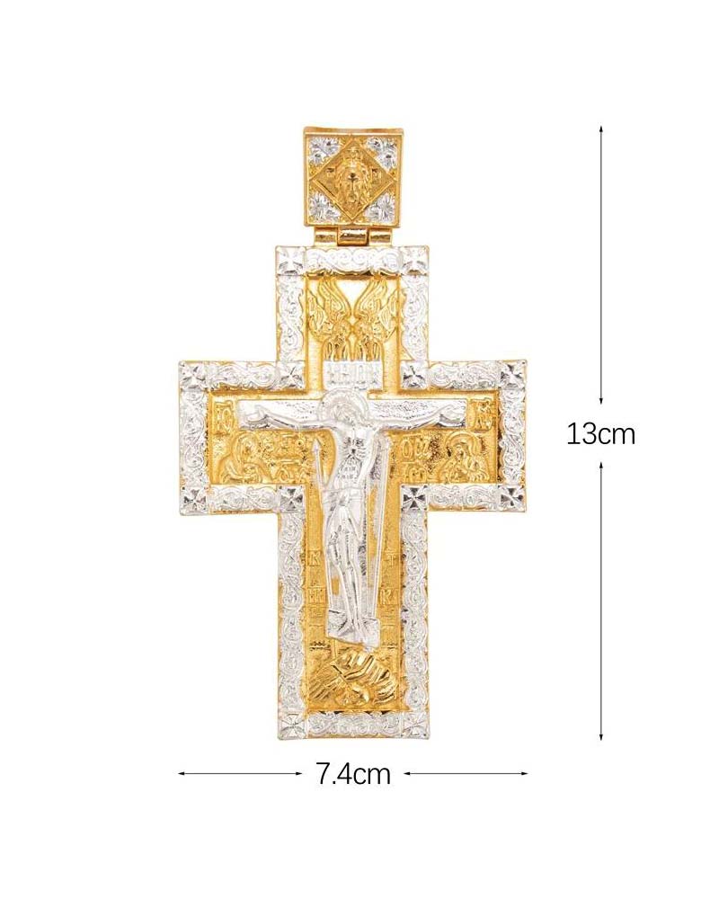 Kreuzanhänger aus vergoldetem Edelstahl, 4,5 x 2,6 cm. Stabile Edelstahlkette mit Karabiner-Verschluss. Das Kreuz ist wie ein Mosaik gestaltet, wobei die Elemente durch das sandgestrahlte Metall opitsch hervorgehoben werden. Dadurch entsteht ein modernes Design.