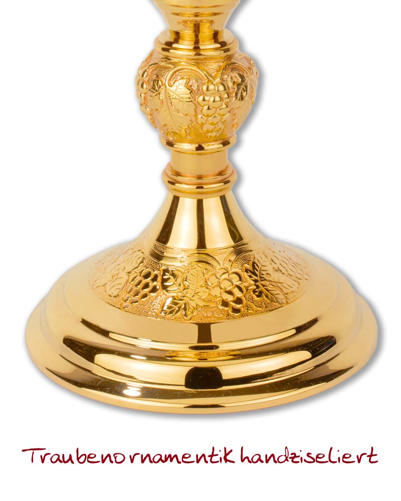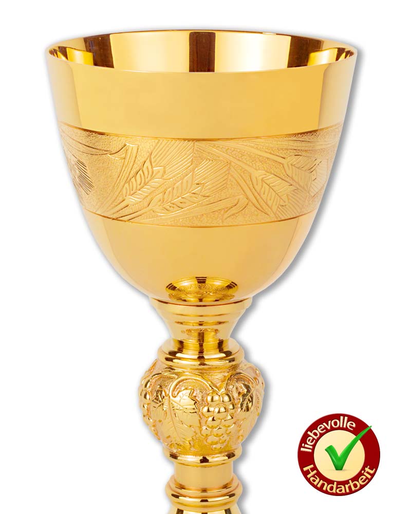 aus filigranen Ähren ziseliert. Der Standfuß und der Nodus sind mit einem Traubendekor geschmückt. Bitte beachten Sie, dass passend zu diesem Kelch auch noch Hostienschale und Ziborium bestellt werden können.